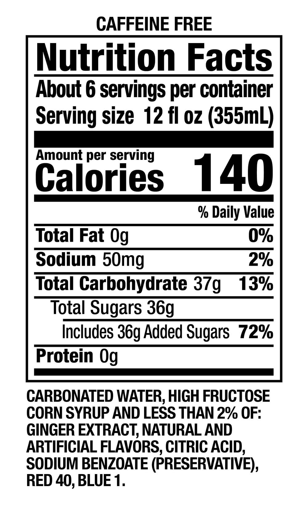 Ingredients: Carbonated Water, High Fructose Corn Syrup and Less than 2% of: Ginger Extract, Natural and Artificial Flavors, Citric Acid, Sodium Benzoate Preservative, Red 40, Blue 1.