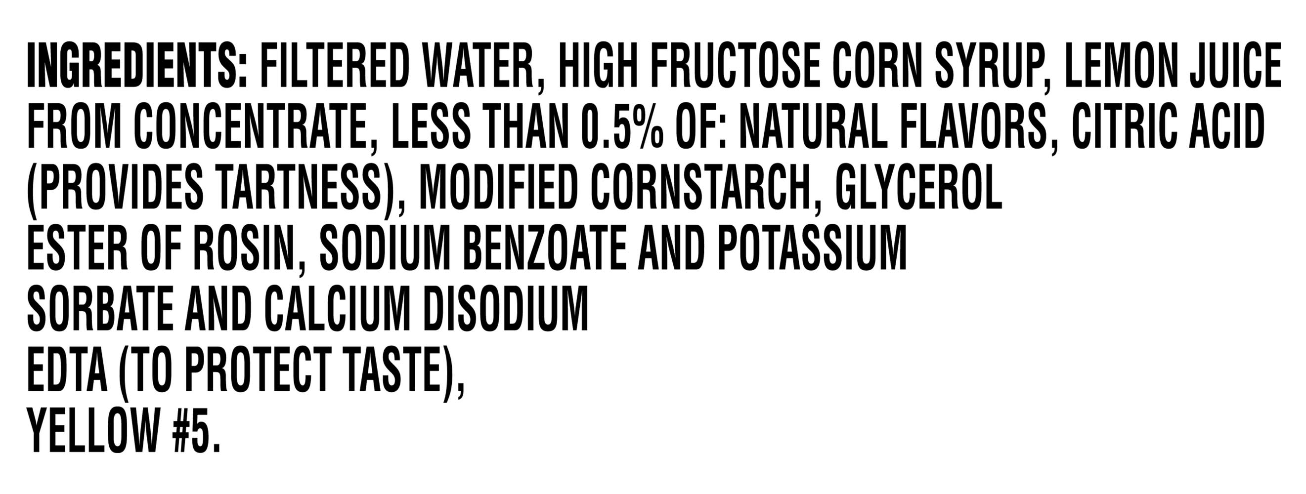 Ingredients: Pure Filtered Water, High Fructose Corn Syrup, Lemon Juice From Concentrate, Less Than 0.5% Of: Natural Flavors, Citric Acid (Provides Tartness), Modified Cornstarch, Glycerol Ester Of Rosin, Sodium Benzoate And Potassium Sorbate And Calcium Disodium Edta (To Protect Taste), Yellow #5. Contains: Corn