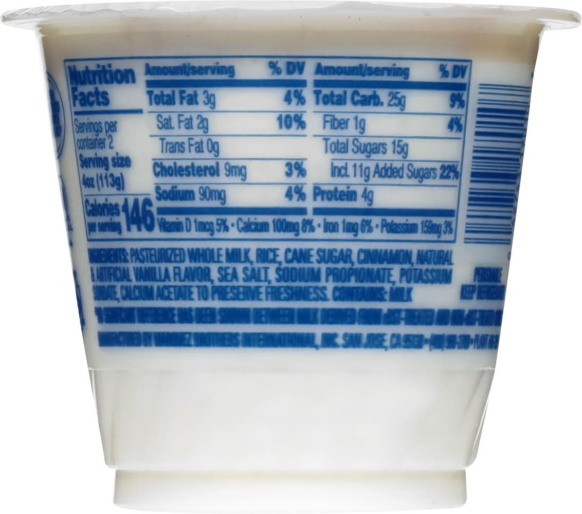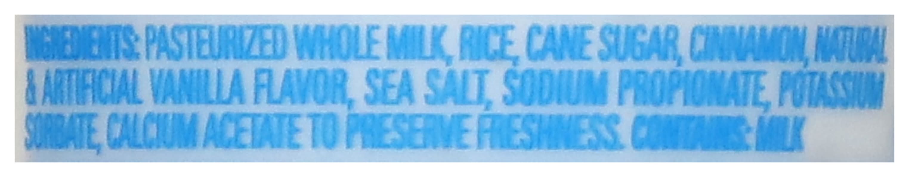 Ingredients: Pasteurized Whole Milk, Rice, Cane Sugar, Cinnamon, Natural & Artificial Vanilla Flavor, Sea Salt, Sodium Propionate, Potassium Sorbate, Calcium Acetate to Preserve Freshness Contains: Milk