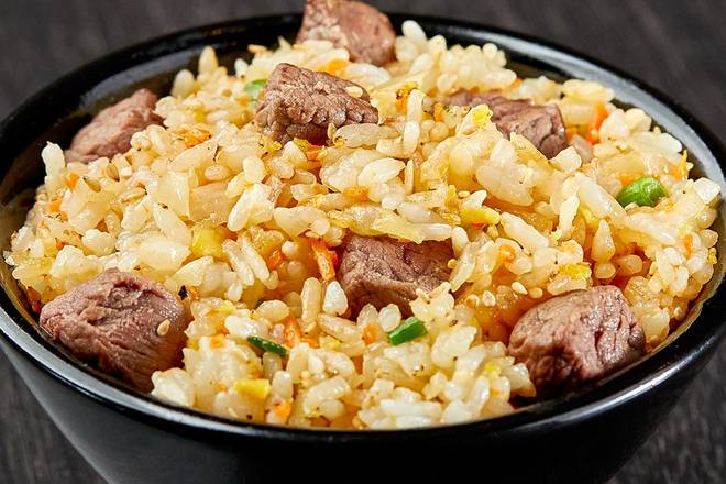 A classic fried rice recipe. Steak, rice, egg and chopped vegetables. (Serves 2)