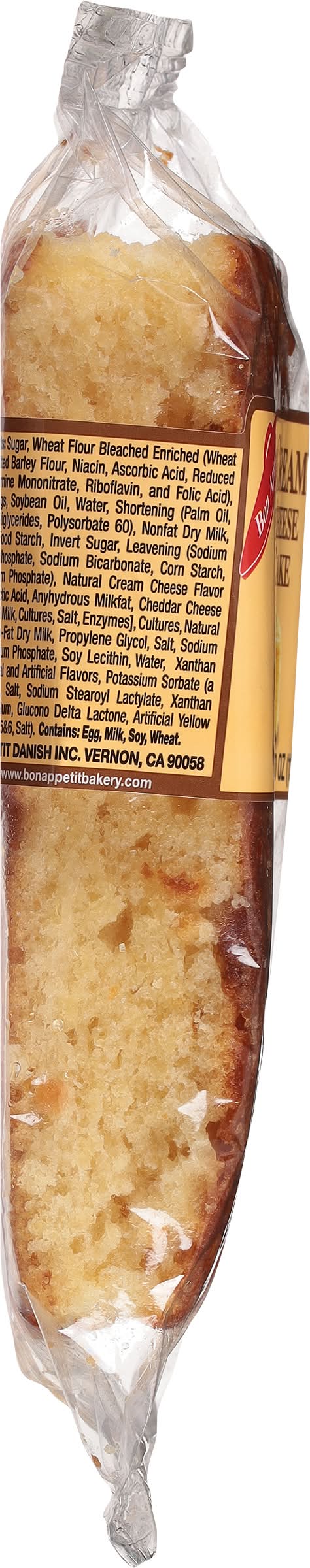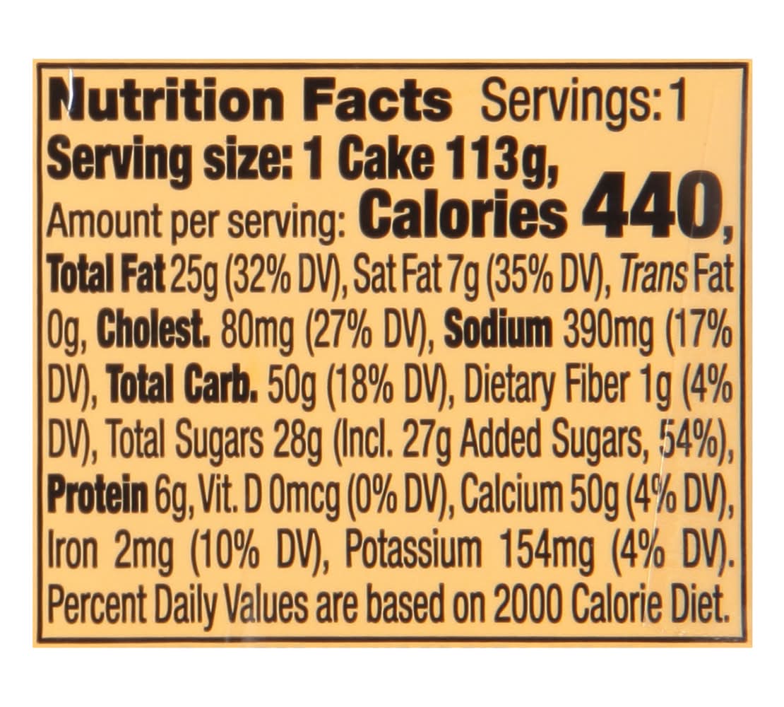 Ingredients: Sugar, Wheat Flour Bleached Enriched (Wheat Flour, Malted Barley Flour, Niacin, Ascorbic Acid, Reduced Iron, Thiamine Mononitrate, Riboflavin, and Folic Acid), Whole Eggs, Soybean Oil, Water, Shortening (Palm Oil, Mono & Diglycerides, Polysorbate 60), Nonfat Dry Milk, Modified Food Starch, Invert Sugar, Leavening (Sodium Acid Pyrophosphate, Sodium Bicarbonate, Corn Starch, Monocalcium Phosphate), Natural Cream Cheese Flavor (Cream, Lactic Acid, Anhydrous Milkfat, Cheddar Cheese [Pasteurized Milk, Cultures, Salt, Enzymes], Cultures, Natural Flavors, Non-Fat Dry Milk, Propylene Glycol, Salt, Sodium Citrate, Sodium Phosphate, Soy Lecithin, Water, Xanthan Gum), Natural and Artificial Flavors, Potassium Sorbate (a Preservative), Salt, Sodium Stearoyl Lactylate, Xanthan Gum, Guar Gum, Glucono Delta Lactone, Artificial Yellow Color (Yellow 5 & 6, Salt) Contains: Eggs, Milk, Soybeans, Wheat, Barley, Corn