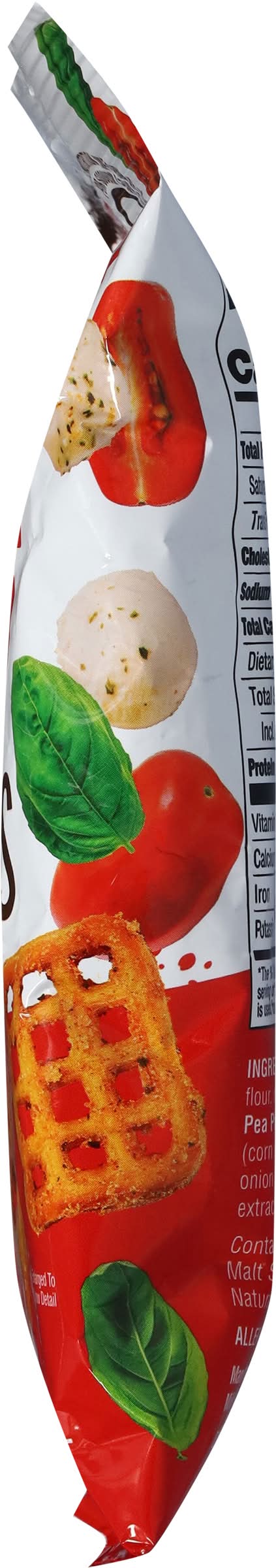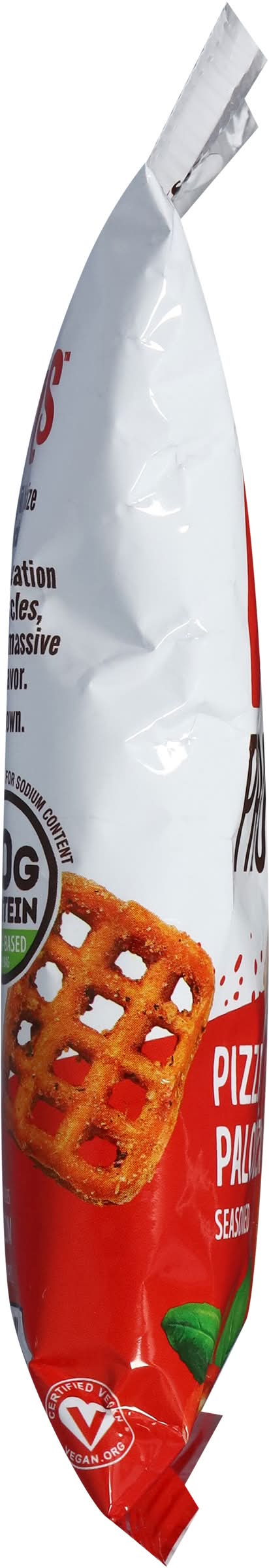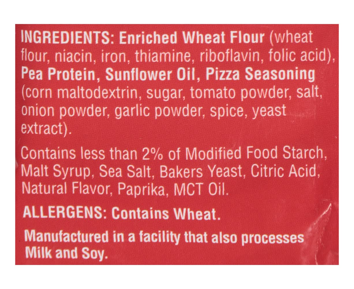 Ingredients: Enriched Wheat Flour (Wheat Flour, Niacin, Iron, Thiamine, Riboflavin, Folic Acid), Pea Protein, Sunflower Oil, Pizza Seasoning (Corn Maltodextrin, Sugar, Tomato Powder, Salt, Onion Powder, Garlic Powder, Spice, Yeast Extract), Contains Less than 2% of Modified Food Starch, Malt Syrup, Sea Salt, Bakers Yeast, Citric Acid, Natural Flavor, Paprika, Mct Oil Contains: Wheat, Corn, Milk, Soybeans