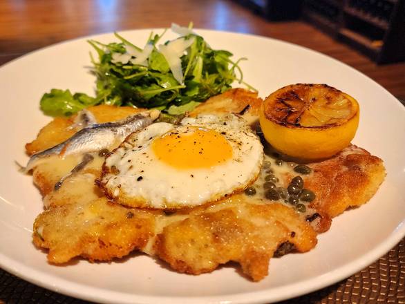breaded and pan fried chicken scallopini, caper butter, sunny side egg, boquerones and arugula side salad