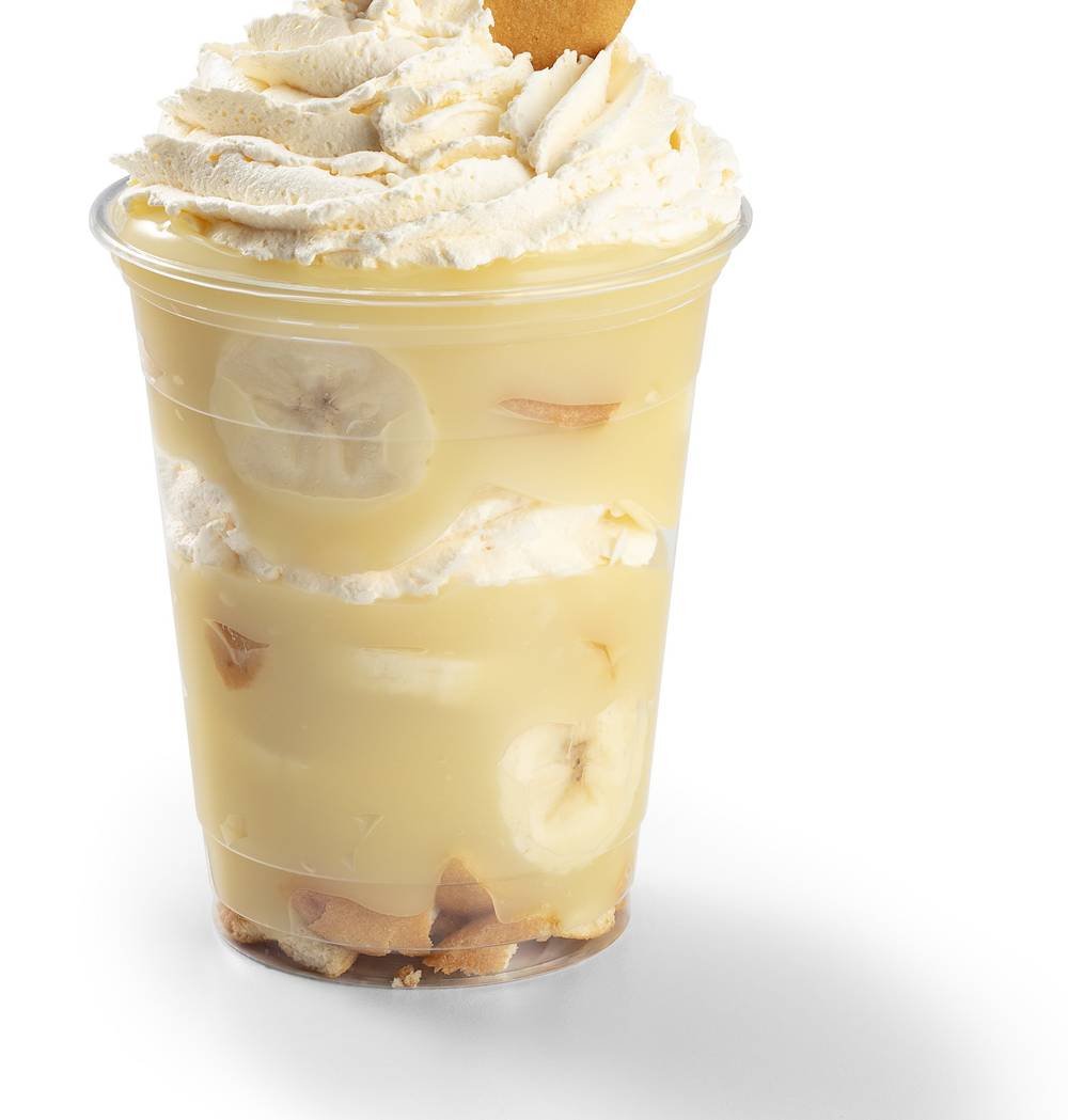 Creamy vanilla pudding, fresh sliced bananas, crushed Vanilla Wafers, and whipped topping in an on the go parfait