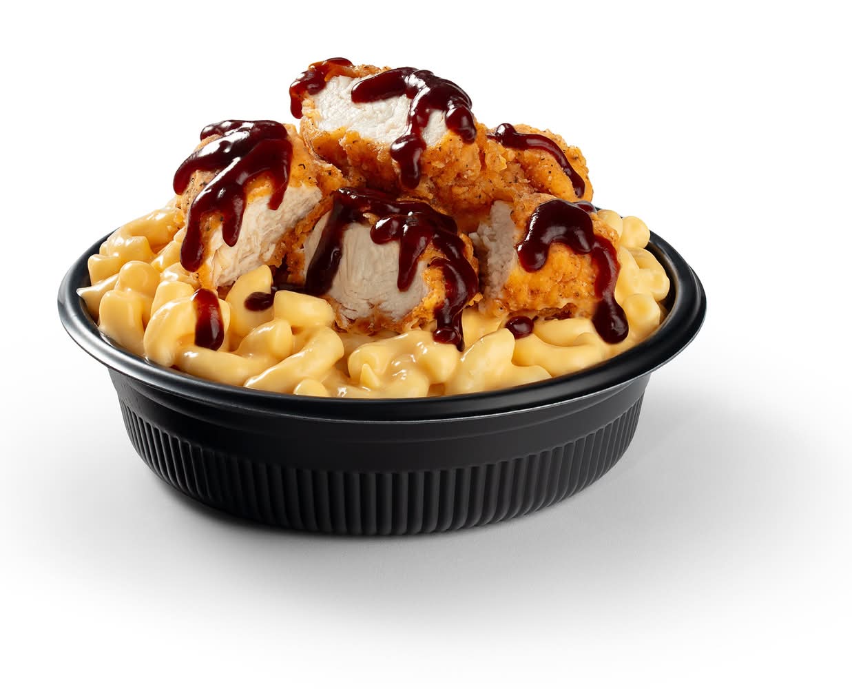 Creamy and cheesy Macaroni and Cheese topped with Honey BBQ sauced double breaded chicken tenders