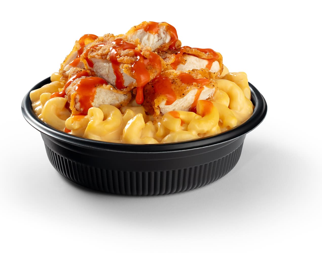 Creamy and cheesy Macaroni and Cheese topped with Buffalo sauced double breaded chicken tenders