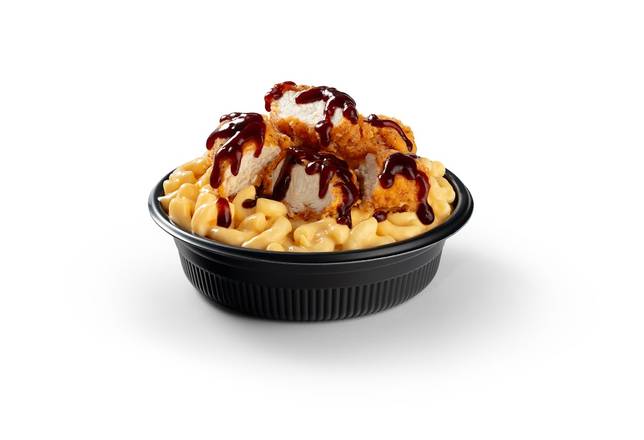 Creamy and cheesy Macaroni and Cheese topped with Honey BBQ sauced double breaded chicken tenders