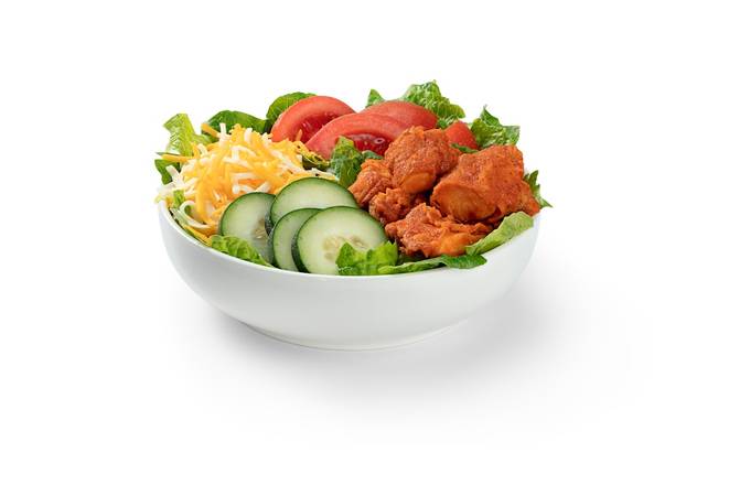 A bed of Romaine lettuce topped with tomato wedges, cucumber slices, shredded cheddar cheese, and Buffalo sauced Roost double breaded chicken tenders