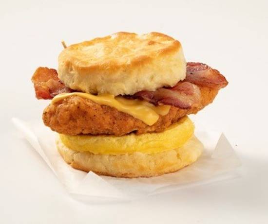 Double Breaded Chicken Tender, Crispy Bacon, Egg & Cheese on a freshly baked and buttered Biscuit