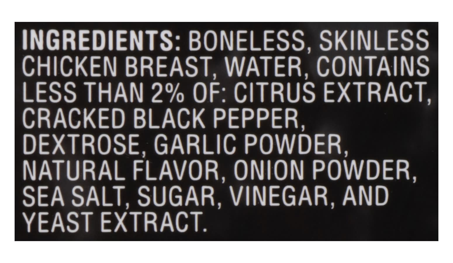 Ingredients: Boneless, Skinless Chicken Breast, Water, Contains Less than 2% of: Citrus Extract, Cracked Black Pepper, Dextrose, Garlic Powder, Natural Flavor, Onion Powder, Sea Salt, Sugar, Vinegar, and Yeast Extract