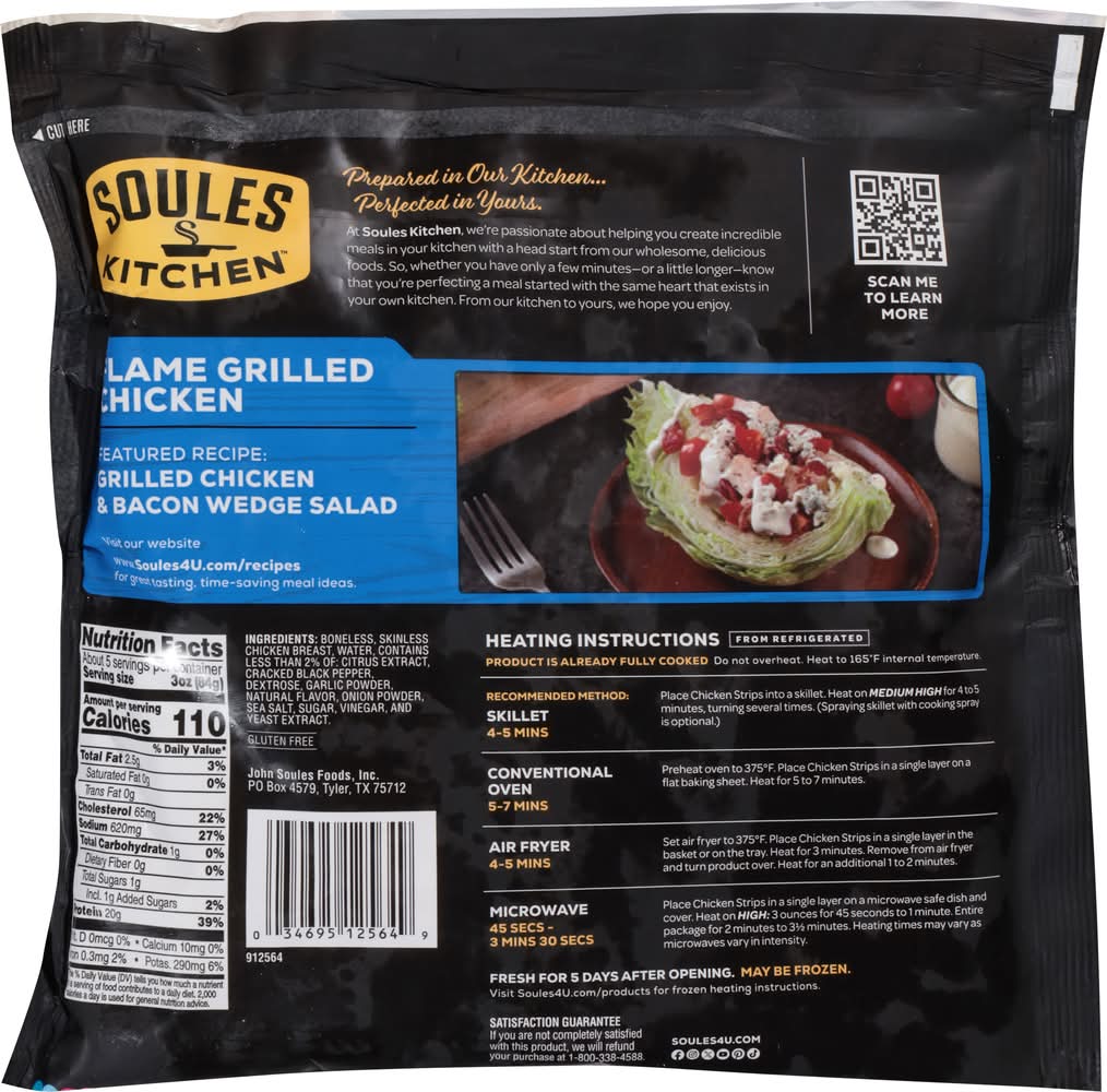 Directions for use: Heating Instructions: Heat to 165 degrees F internal temperature. Do not overheat. Product is already fully cooked. Sizzle in Skillet: 4-6 Minutes (Recommended Method): Place thawed Grilled Chicken Breast Strips into skillet over Medium High heat. (Spraying skillet with a non-stick cooking spray is optional.) Cook for 4 to 6 minutes, turning several times. Conventional Oven: 7-10 Minutes: Preheat oven to 375 degrees F. Place thawed Grilled Chicken Breast Strips into one layer on a flat baking sheet. Bake for 7 to 10 minutes. Microwave: 3-4 Minutes: Place thawed Grilled Chicken Breast Strips into one layer on a microwave safe dish and cover. For 3 to 6 ounces, microwave on high for 30 seconds to 1 minute. For the entire package, microwave on high for 3 to 4 minutes. Cook times may vary as microwaves vary in cooking intensity. Keep refrigerated. May be frozen. Resalable strip! Just peel from edge and stick back on bag as indicated. Fresh for 5 days after opening. Storage recommendation: Keep refrigerated. May be frozen.
