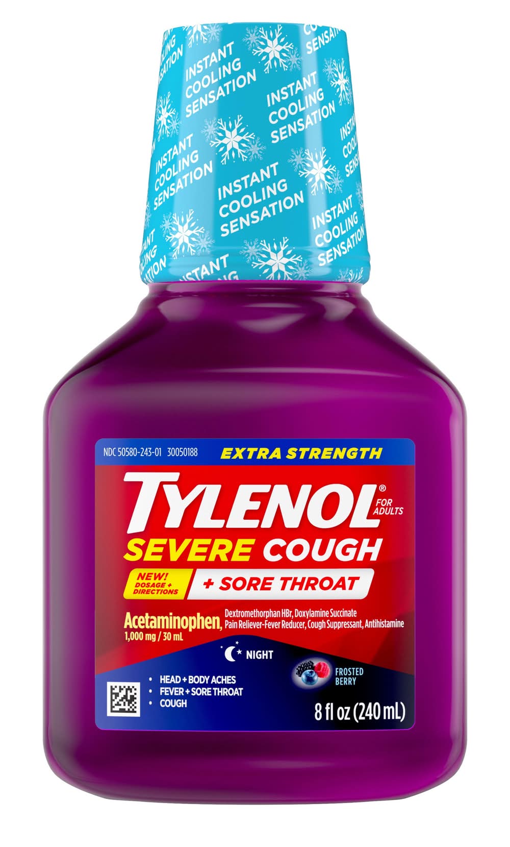 Tylenol Extra Strength Severe Cough + Sore Throat Night Liquid For Adults, Frosted Berry (8 fl oz)