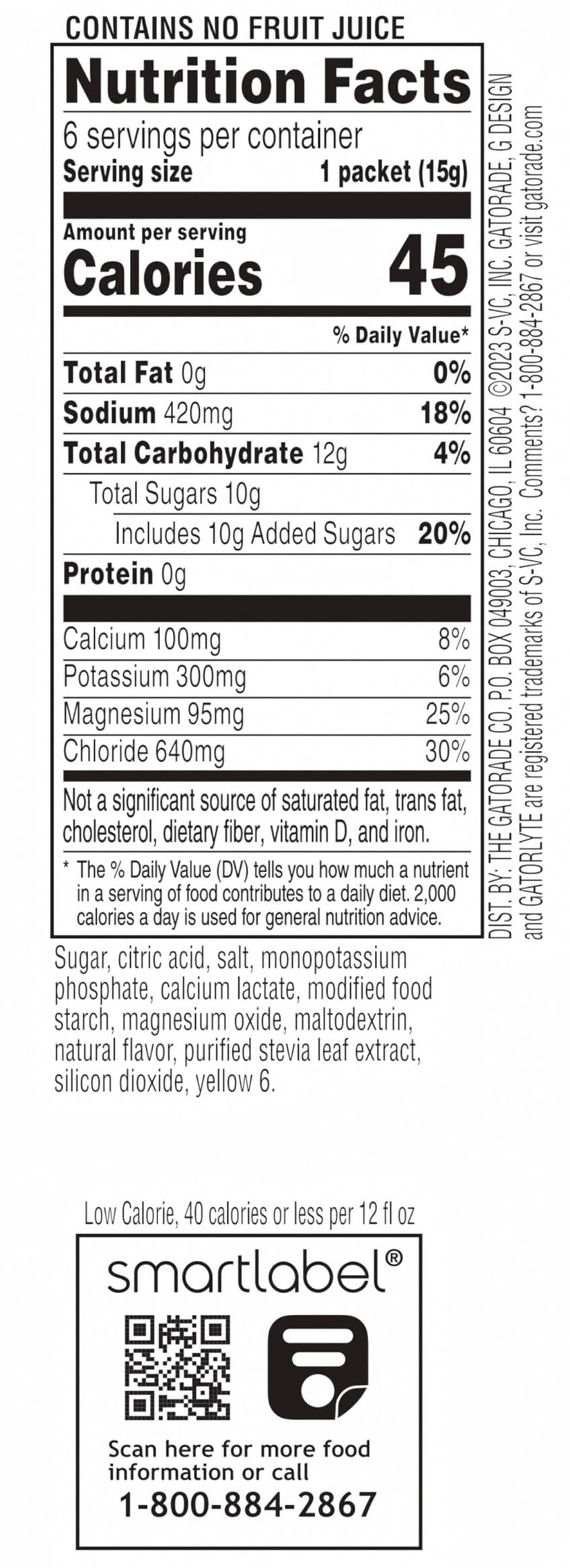 Ingredients: Sugar, Citric Acid, Salt, Monopotassium Phosphate, Calcium Lactate, Modified Food Starch, Magnesium Oxide, Maltodextrin, Natural Flavor, Purified Stevia Leaf Extract, Silicon Dioxide, Yellow 6
