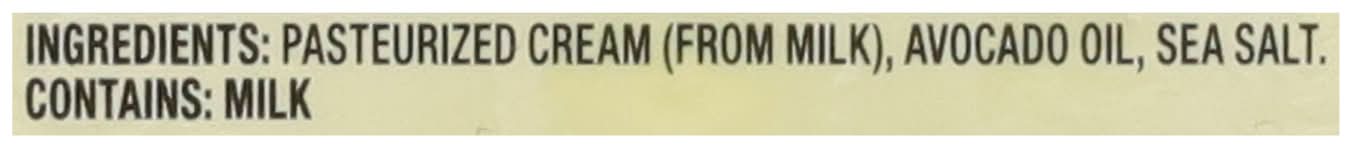 Ingredients: Pasteurized Cream (from Milk), Avocado Oil, Sea Salt Contains: Milk