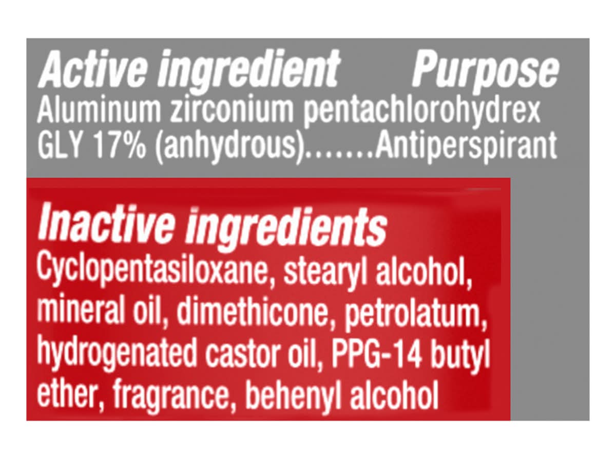 Ingredients: Active Ingredients: Aluminum Zirconium Pentachlorohydrex Gly (Anhydrous) (17 %), Antiperspirant. Inactive Ingredients: Cyclopentasiloxane, Stearyl Alcohol, Mineral Oil, Dimethicone, Petrolatum, Hydrogenated Castor Oil, PPG-14 Buty Ether, Fragrance, Behenyl Alcohol