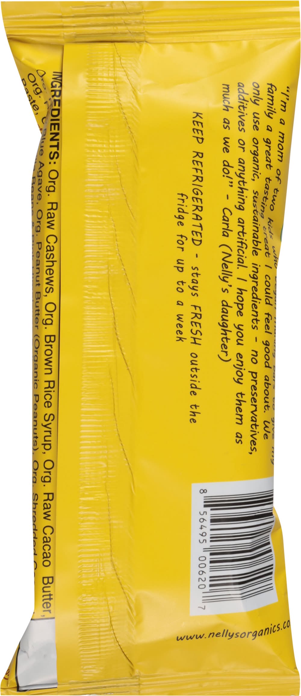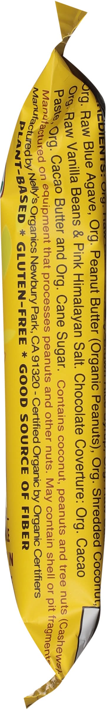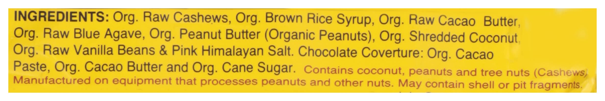 Ingredients: Organic Raw Cashews, Organic Brown Rice Syrup, Organic Raw Cacao Butter, Organic Raw Blue Agave, Organic Peanut Butter (Organic Peanuts), Organic Raw Shredded Coconut, Organic Raw Vanilla Beans & Pink Himalayan Salt, Organic Chocolate Coating: Organic Chocolate Liquor, Organic Cacao Butter, Organic Cane Sugar, Organic Vanilla. Contains: Peanuts Tree Nuts Peanuts