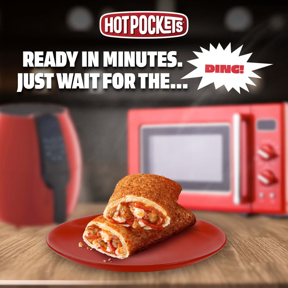 Directions for use: Cook thoroughly. Microwave Oven Cooking Instructions for Hot Pockets Brand Sandwiches. Load it. Unwrap sandwich, load it into crisping sleeve, and place on paper plate. Heat it. Cook it in the magical heating machine, A.K.A. the microwave. Cooking time on high. Quantity: 1 sandwich; 1100 Watt Oven: 1:50 (Ovens vary, cooking time may need to be adjusted. Keep frozen. For food safety and quality, read and follow these cooking instructions to ensure product reaches internal temperature of 165 degrees F. Cook thoroughly before eating. Product will be hot! Save your tastebuds and wait for your sandwich to cool); Lower Wattage/Compact Microwave: 2:45 (Ovens vary, cooking time may need to be adjusted. Keep frozen. For food safety and quality, read and follow these cooking instructions to ensure product reaches internal temperature of 165 degrees F. Cook thoroughly before eating. Product will be hot! Save your tastebuds and wait for your sandwich to cool). Quantity: 2 sandwiches; 1100 Watt Oven: 3:30 (Ovens vary, cooking time may need to be adjusted. Keep frozen. For food safety and quality, read and follow these cooking instructions to ensure product reaches internal temperature of 165 degrees F. Cook thoroughly before eating. Product will be hot! Save your tastebuds and wait for your sandwich to cool); Lower Wattage/Compact Microwave: For best results, cook one at a time. Enjoy it. Let sit 2 minutes to complete cooking, and enjoy! Air Fryer: Try air frying for an even crispier crunch! Unwrap sandwich and place in bottom of air fryer. Do not use crisping sleeve in air fryer. For 1 sandwich, set air fryer at 360 degrees for 15 minutes (Direction developed using various sized air fryer; cook times may need to be adjusted). For 2 sandwiches, place separately and set air fryer at 360 degrees F for 16 minutes (Direction developed using various sized air fryer; cook times may need to be adjusted). Carefully remove from air fryer. Conventional Oven: Preheat oven to 350 degrees F, unwrap sandwich and place on baking sheet. Do not use crisping sleeve in oven. Bake for 26 minutes (Ovens vary, cooking time may need to be adjusted. Keep frozen. For food safety and quality, read and follow these cooking instructions to ensure product reaches internal temperature of 165 degrees F. Cook thoroughly before eating. Product will be hot! Save your tastebuds and wait for your sandwich to cool), then carefully remove from oven. Keep frozen. Storage recommendation: Keep frozen.