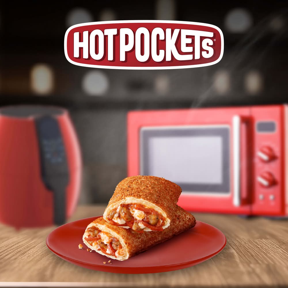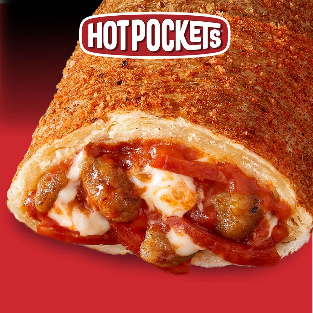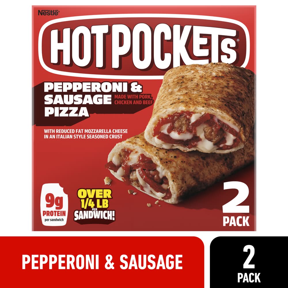 Dive into the cheesy, saucy and savory world of snacking with Hot Pockets Pepperoni and Sausage Pizza Frozen Snacks. Indulge in these frozen sandwiches made with pepperoni and sausage and reduced fat mozzarella cheese in an italian style seasoned crust. These pepperoni pizza snacks aren’t like your average frozen lunch snack. Hot Pockets pepperoni and sausage pizza frozen sandwiches are hunger’s worst nightmare. Whether you’re looking for quick lunch snacks or an easy dinner, Hot Pockets frozen pizza snacks are perfect for any occasion. Each Hot Pocket frozen sandwich is a good source of protein with 9 grams of protein per sandwich. This microwave food is a snap to prepare in just a few minutes. If you have a little more time, you can bake these frozen lunch snacks in the oven or the air fryer. No matter how you prepare them, Hot Pockets Pepperoni and Sausage Pizza frozen sandwiches are hot and delicious every time. Keep Hot Pockets Pepperoni and Sausage Pizza Frozen Snacks in the freezer until you're ready to cook and eat. Try Hot Pockets Breakfast, Big & Bold and Deliwich frozen snacks to amp up your snacktime with titanic flavor. Packaging: Reusable