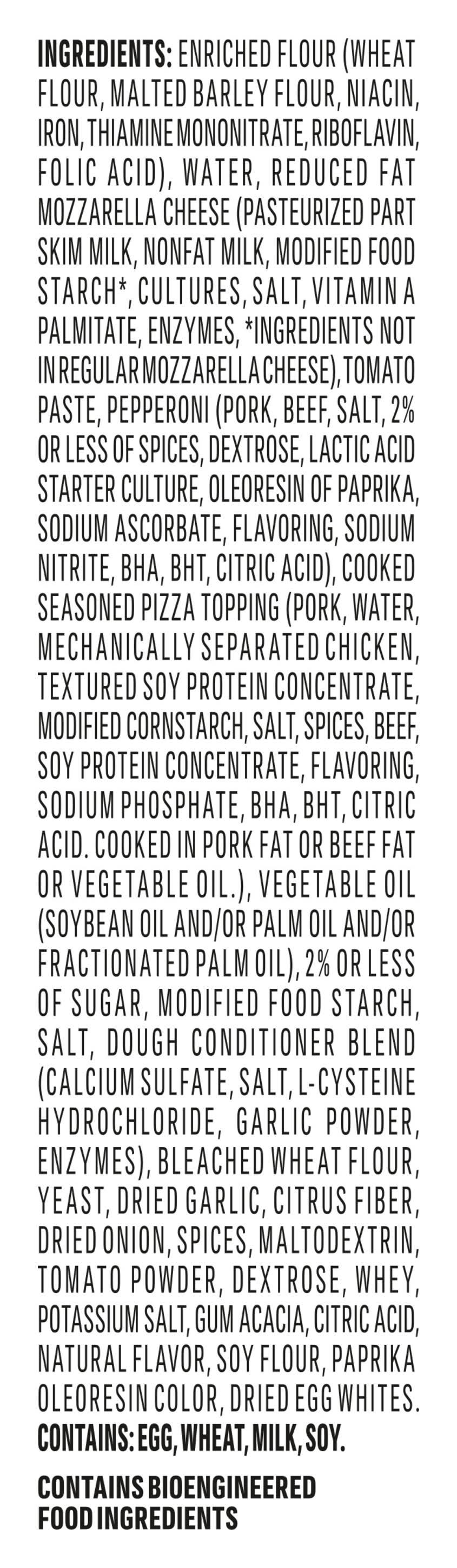 Ingredients: ENRICHED FLOUR (WHEAT FLOUR, MALTED BARLEY FLOUR, NIACIN, IRON, THIAMINE MONONITRATE, RIBOFLAVIN, FOLIC ACID), WATER, REDUCED FAT MOZZARELLA CHEESE (PASTEURIZED PART SKIM MILK, NONFAT MILK, MODIFIED FOOD STARCH*, CULTURES, SALT, VITAMIN A PALMITATE, ENZYMES, *INGREDIENTS NOT IN REGULAR MOZZARELLA CHEESE), TOMATO PASTE, PEPPERONI (PORK, BEEF, SALT, 2% OR LESS OF SPICES, DEXTROSE, LACTIC ACID STARTER CULTURE, OLEORESIN OF PAPRIKA, SODIUM ASCORBATE, FLAVORING, SODIUM NITRITE, BHA, BHT, CITRIC ACID), COOKED SEASONED PIZZA TOPPING (PORK, WATER, MECHANICALLY SEPARATED CHICKEN, TEXTURED SOY PROTEIN CONCENTRATE, MODIFIED CORNSTARCH, SALT, SPICES, BEEF, SOY PROTEIN CONCENTRATE, FLAVORING, SODIUM PHOSPHATE, BHA, BHT, CITRIC ACID. COOKED IN PORK FAT OR BEEF FAT OR VEGETABLE OIL.), VEGETABLE OIL (SOYBEAN OIL AND/OR PALM OIL AND/OR FRACTIONATED PALM OIL), 2% OR LESS OF SUGAR, MODIFIED FOOD STARCH, SALT, DOUGH CONDITIONER BLEND (CALCIUM SULFATE, SALT, L-CYSTEINE HYDROCHLORIDE, GARLIC POWDER, ENZYMES), BLEACHED WHEAT FLOUR, YEAST, DRIED GARLIC, CITRUS FIBER, DRIED ONION, SPICES, MALTODEXTRIN, TOMATO POWDER, DEXTROSE, WHEY, POTASSIUM SALT, GUM ACACIA, CITRIC ACID, NATURAL FLAVOR, SOY FLOUR, PAPRIKA OLEORESIN COLOR, DRIED EGG WHITES. Contains: CONTAINS: EGG, WHEAT, MILK, SOY.