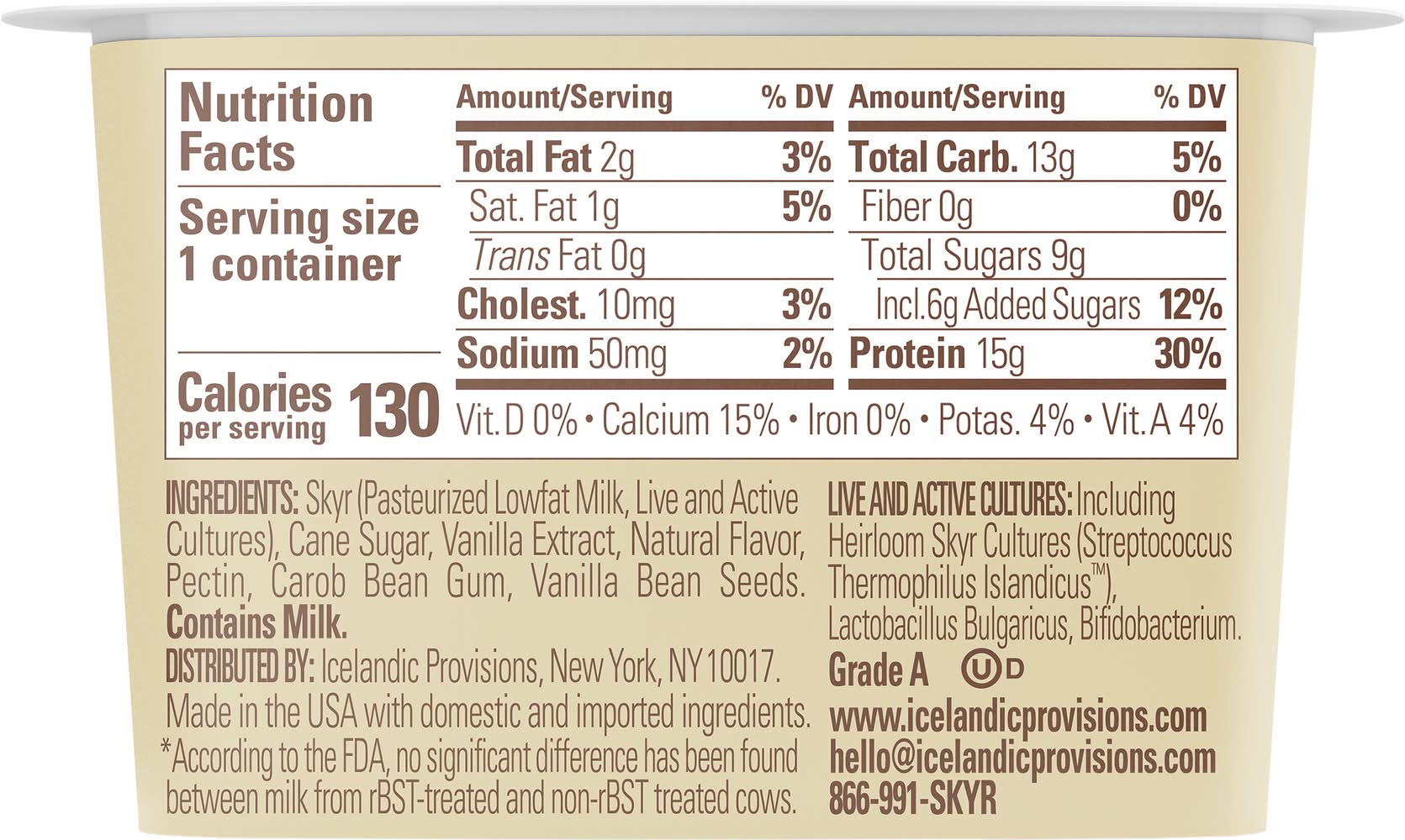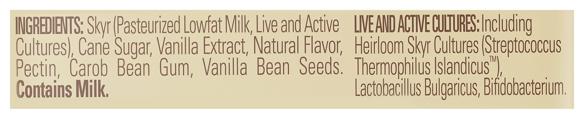 Ingredients: Skyr (Pasteurized Lowfat Milk, Live and Active Cultures), Cane Sugar, Vanilla Extract, Natural Flavor, Pectin, Carob Bean Gum, Vanilla Bean Seeds, Live and Active Cultures: Including Heirloom Skyr Cultures (Streptococcus Thermophilus Islandicus), Lactobacillus Bulgaricus, Bifidobacterium Contains: Milk