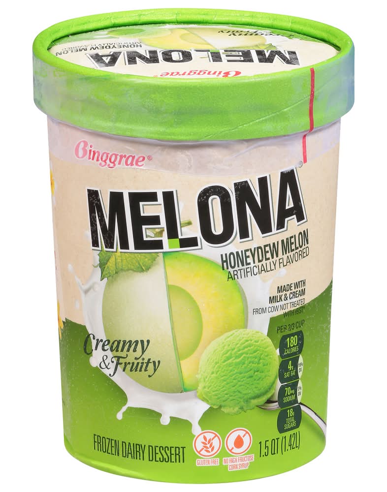 Artificially flavored. Per 2/3 Cup: 180 calories; 4 g sat fat (19% DV); 70 mg sodium (3% DV); 18 g total sugars. Gluten free. Binggrae. Made with milk & cream from cow not treated with rBST (No significant difference has been shown between milk derived from rBST treated and non-rBST treated cows). Creamy & fruity. No high fructose corn syrup. Melona brings back your memories of Hawaii where you definitely experienced. The Melona ever! www.melonaicecream.com. Follow EnjoyMelona! Facebook. Instagram. Twitter. Tag (at)EnjoyMelona and hashtag (hashtag)EnjoyMelona to show us how much you love fruity & creamy Melona bars! Made in USA. Flavor: Honeydew melon