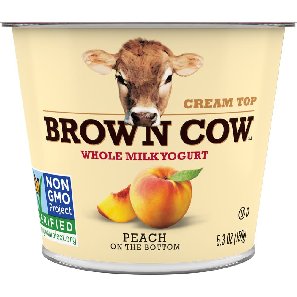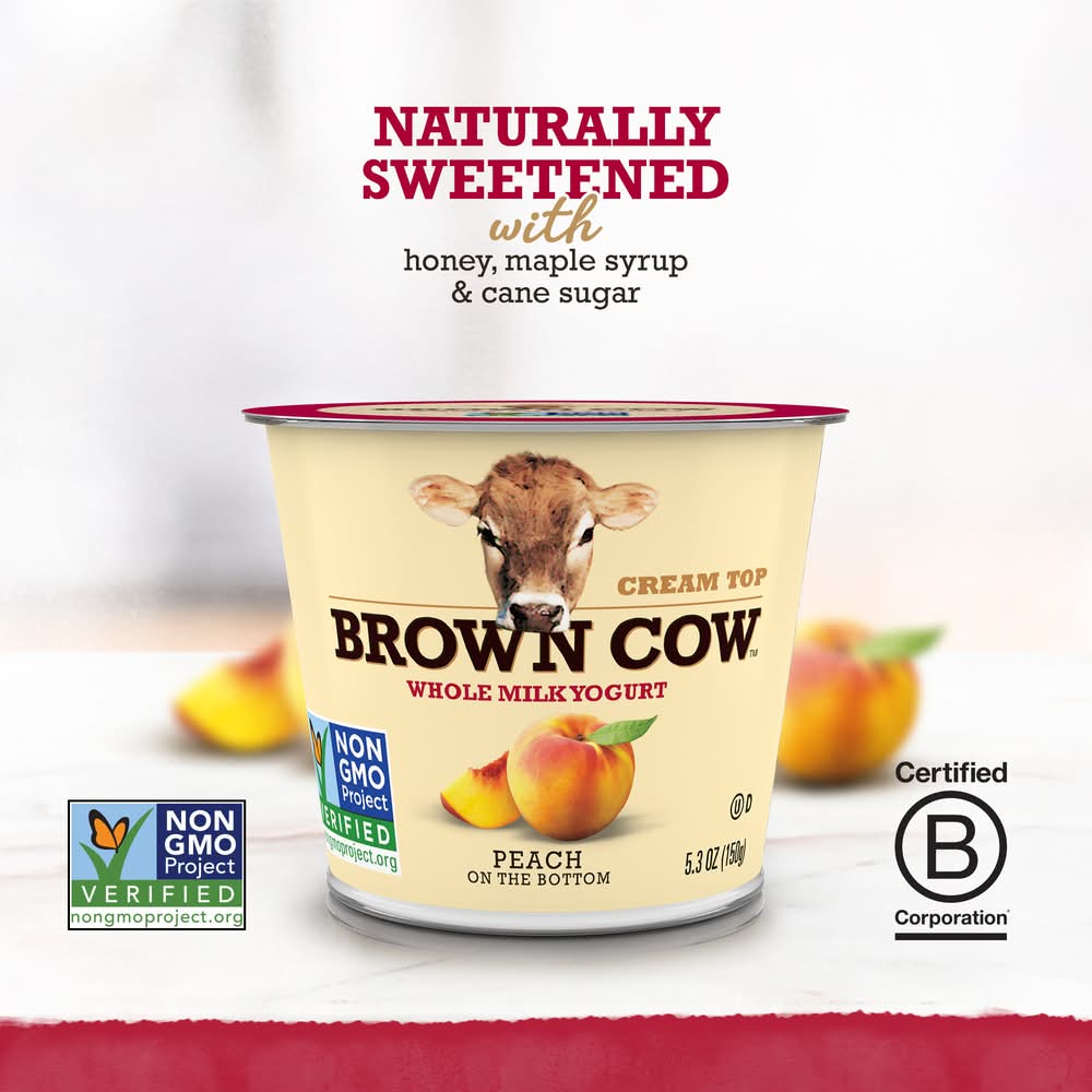 Brown Cow Cream Top Whole Milk Yogurt, Peach On Bottom, 5.3 oz. • Stonyfield Farm, Inc., Londonderry, NH, 03053 • Packaging: Reusable