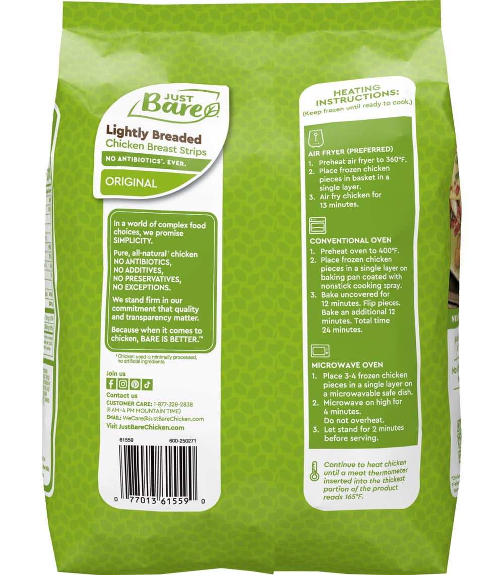 Just Bare� Lightly Breaded Chicken Breast Strips are delicious as a main entrTe, snack or addition to your favorite dishes. With 16g of protein per serving, our Chicken Breast Strips are breaded to perfection and ready to serve after just 13 minutes in the air fryer. These are made with boneless chicken breast raised with no antibiotics ever, providing convenience you can feel good about. Ready in minutes, they deliver quality and consistency you can rely on to make your meals amazing.Just Bare� Chicken is made with high quality protein to elevate your everyday meals. Our products are made with all white meat chicken breast raised with no antibiotics ever, and no artificial ingredients or preservatives. We provide quality and consistency you can rely on to make your meals amazing. Ready in minutes, they provide wholesome convenience you can feel good about. When it has to be Just Right, it has to be Just Bare. Flavor: Original