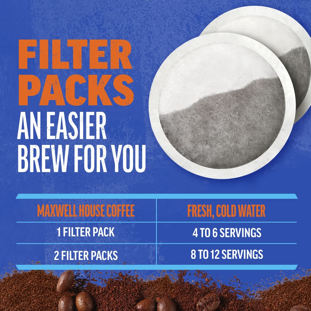 Brewing instructions: step 1 - use one filter pack to make 4 to 6 (6 fl.oz) cups of coffee. use two filter packs to maker 8 to12 cups. step 2 - auto - drip coffee makers with round brew baskets: gently place filter pack in basket, turning edges up against sides of basket. auto - drip coffee makers with cone - shaped brew baskets: place filter pack in basket; gently press into cone. step 3 - measure water by following water measurement markings on your coffee maker. use more or less water to suit your taste. be sure coffee in filter pack is evenly distributed. round place in gently turning edges up against sides. cone - shaped push in gently. maxwell house coffee: 1 filter pack; 4 to 6 6 fl oz cups fresh, cold water. maxwell house coffee: 2 filter pack; 8 to 12 6 fl oz cups fresh, cold water. adjust amount of water according to strength preference. for best results, start with clean coffee maker and fresh, cold water. close container tightly after use.