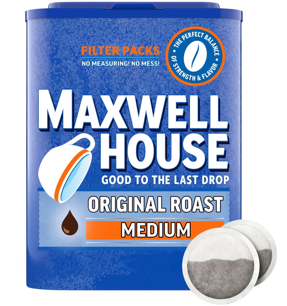 Maxwell House Original Roast Ground Coffee Filter Packs have a consistent signature taste that is good to the last drop. This rich, full-bodied medium original roast coffee is exceptionally smooth and is the perfect start to your day for a quick coffee option during your morning rush. Made with 100% pure coffee, this original roast is great served black or with cream and sugar. Brew a pot of this coffee easily in your drip coffee maker. This ground coffee comes individually wrapped in filter packs for easy brewing with no measuring or messes. Each 5.3 ounce box contains 10 coffee packets. From lively light roasts to full bodied dark blends, Maxwell House's signature taste is created through a process that isn't done the easy way, but the right way, for 125 years. Kraft Heinz Foods, Chicago, IL, 60601, Ph: 800-432-6333