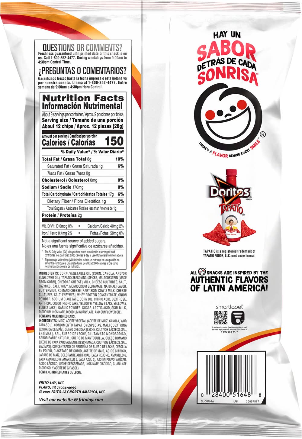 Hot sauce. There's a flavor behind every smile. All snacks are inspired by the authentic flavors of Latin America. • Flavor: Tapatio • Frito-Lay, Inc., Plano, Tx, 75024-4099.