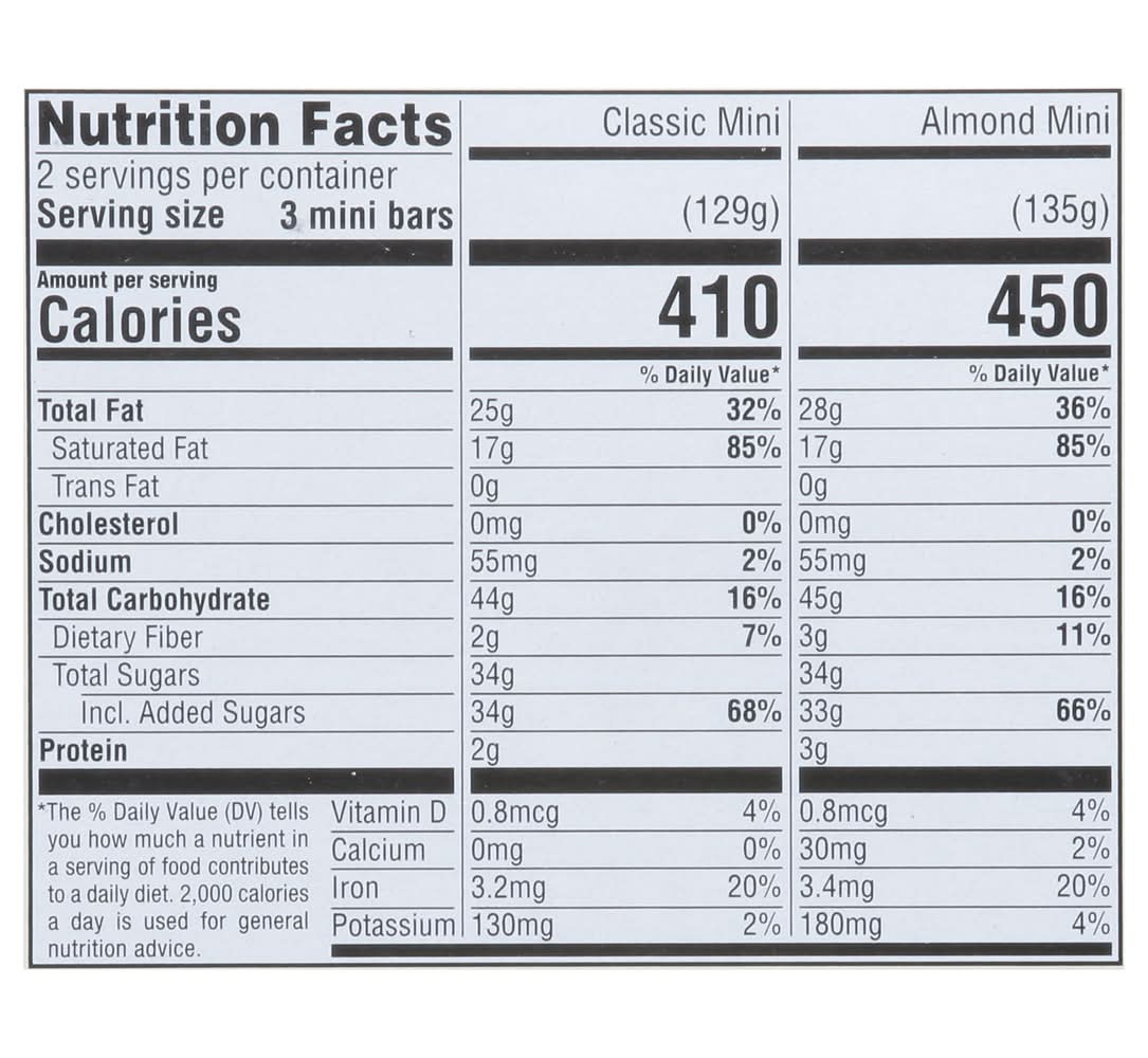Ingredients: Classic Mini: Water, Sugar, Cocoa Butter, Chocolate, Glucose-Fructose Syrup (Wheat, Corn), Coconut Oil, Less than 2% of: Fructose, Pea Protein, Sunflower Lecithin, Locust Bean Gum, Guar Gum, Sea Salt, Vegetable Juice (for Color), Vanilla Bean Specks, Natural Flavor, Fruit Juice (for Color), Citric Acid. Almond Mini: Water, Sugar, Cocoa Butter, Chocolate, Glucose-Fructose Syrup (Wheat, Corn), Coconut Oil, Almonds, Less than 2% of: Fructose, Pea Protein, Sunflower Lecithin, Locust Bean Gum, Guar Gum, Sea Salt, Vegetable Juice (for Color), Vanilla Bean Specks, Natural Flavor, Fruit Juice (for Color), Citric Acid. Contains: Wheat, Corn, Tree Nuts, Coconuts, Tree Nuts, Almonds, Tree Nuts, Soybeans
