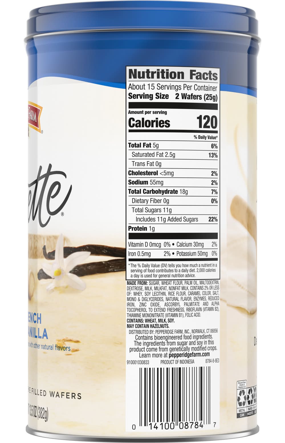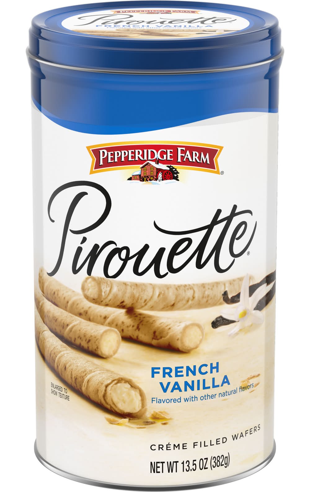 Whether paired with morning tea or coffee, added as an adorable cupcake decoration, or partnered with ice cream, Pepperidge Farm Pirouette French Vanilla Créme-Filled Wafers deliver absolute indulgence in every perfect bite. These pastry-like wafers are baked to a delicate crisp, and filled with a luscious, creamy vanilla flavored filling. They have a European flair that makes serving them extra special even if it’s a treat just for you. The 13.5-ounce tin helps keep them fresh, so you can continue to savor the sophisticated sweetness. These Pepperidge Farm Pirouette French Vanilla Créme Filled Wafers are beautifully crafted because, for Pepperidge Farm, baking is more than a job, it's a real passion. Each day, our bakers take the time to make every cookie, pastry, cracker, and loaf of bread the best way they know how by using carefully selected, quality ingredients. So go ahead and give in to delicious indulgence. • Flavor: French vanilla • Pepperidge Farm, Inc., Norwalk,CT,06856 • Packaging: Reusable