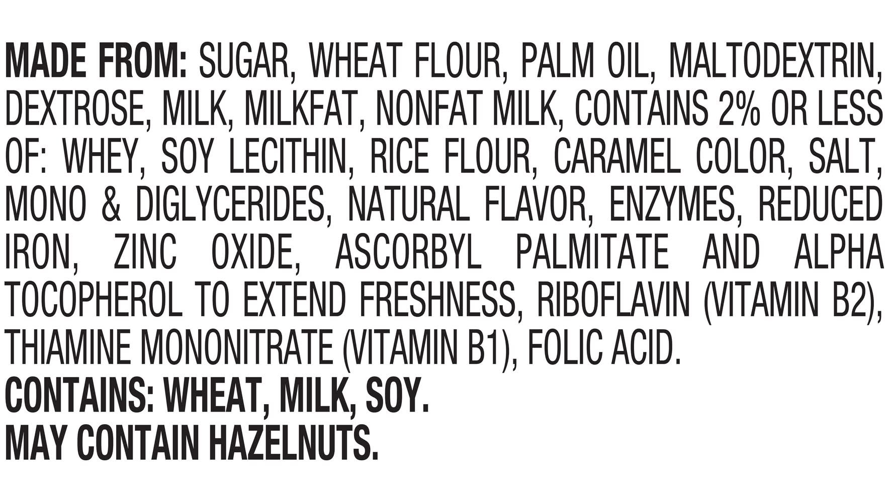 Ingredients: Sugar, Wheat Flour, Palm Oil, Maltodextrin, Dextrose, Milk, Milkfat, Nonfat Milk, Contains 2% or less of: Whey, Soy Lecithin, Rice Flour, Caramel Color, Salt, Mono & Diglycerides, Natural Flavor, Enzymes, Reduced Iron, Zinc Oxide, Ascorbyl Palmitate and Alpha Tocopherol to extend freshness, Riboflavin (Vitamin B2), Thiamine Mononitrate (Vitamin B1), Folic Acid Contains: Wheat, Milk, Soybeans, Tree Nuts, Hazelnuts/Filberts