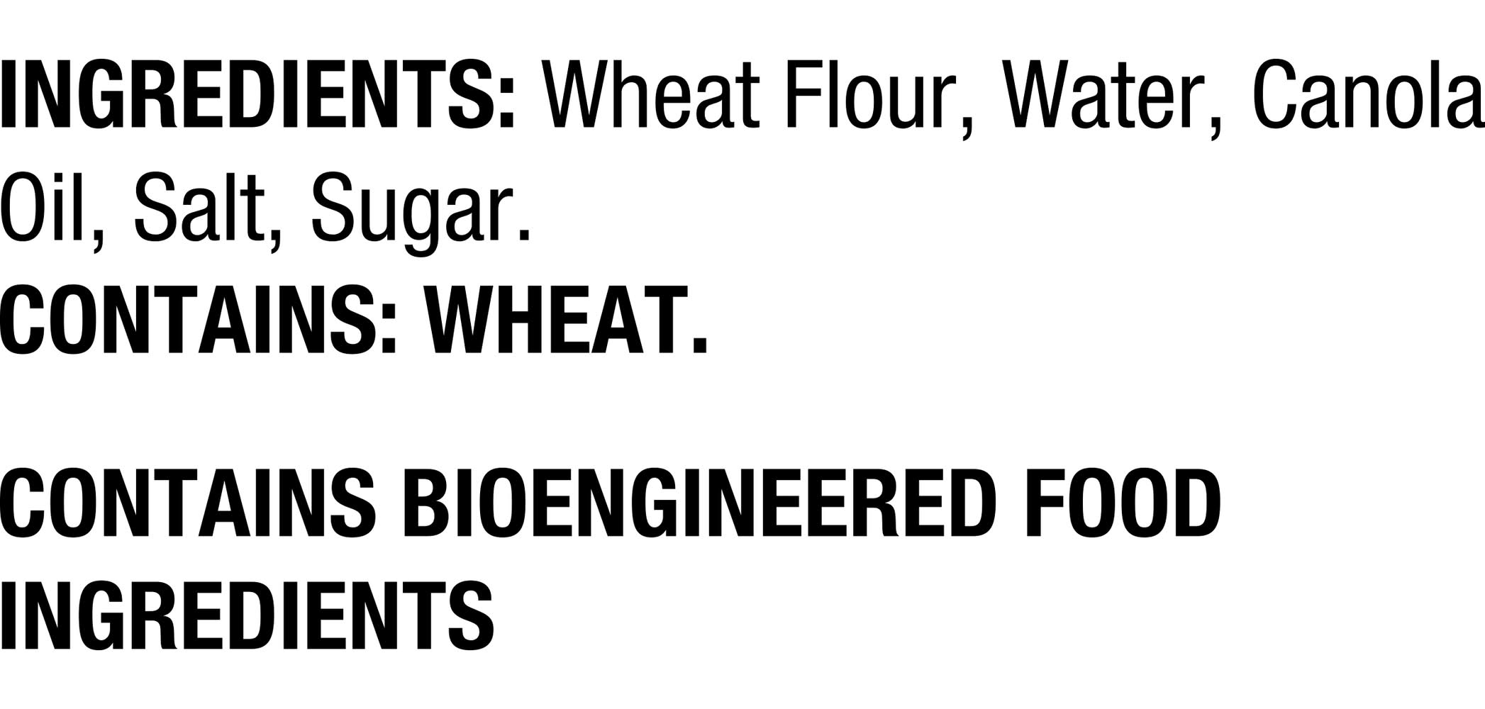 Ingredients: Wheat Flour, Water, Canola Oil, Salt, Sugar. Contains: Wheat