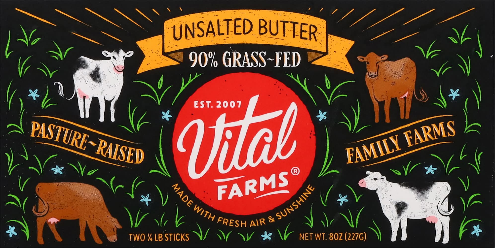 90% grass-fed. Est. 2007. Pasture-raised. Family farms. Made with fresh air & sunshine. Pasture-raised on family farms. Here, our purpose is to improve the lives of people, animals & the planet through food. We're on a mission to bring ethically produced food to the table. Pasture Raised: The cows spend their time grazing outside during the warm months. Grass-Fed: 90% of what the girls eat is grass, while the remaining 10% is nutritionally balanced feed to ensure they have a well-rounded diet. For rich creaminess. • Vital Farms, Austin, TX, 78704 • Packaging: Reusable