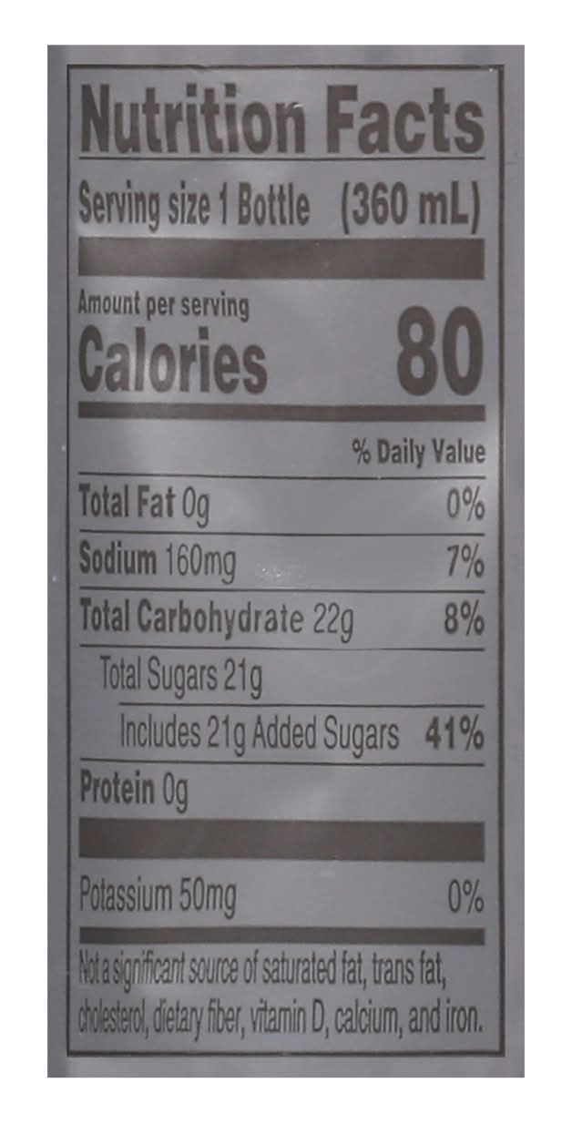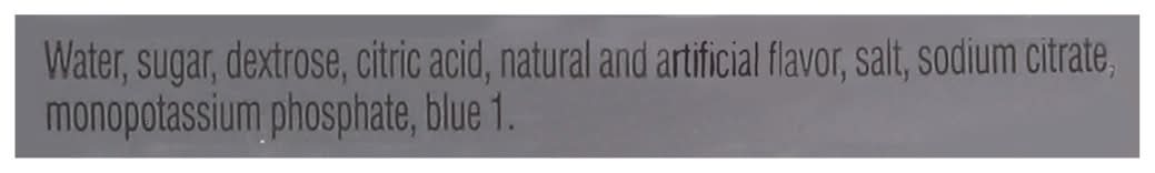Ingredients: Water, Sugar, Dextrose, Citric Acid, Natural and Artificial Flavor, Salt, Sodium Citrate, Monopotassium Phosphate, Blue 1