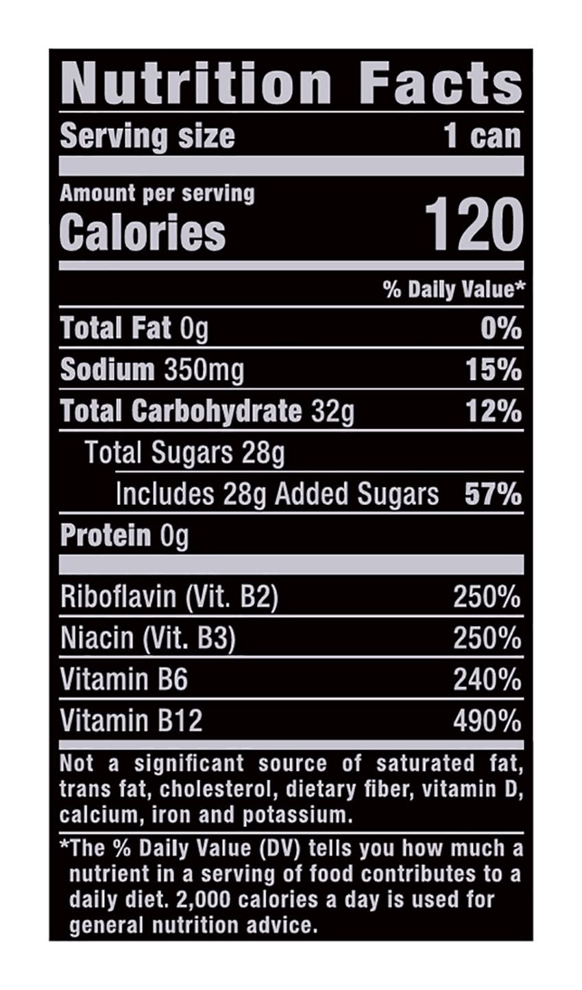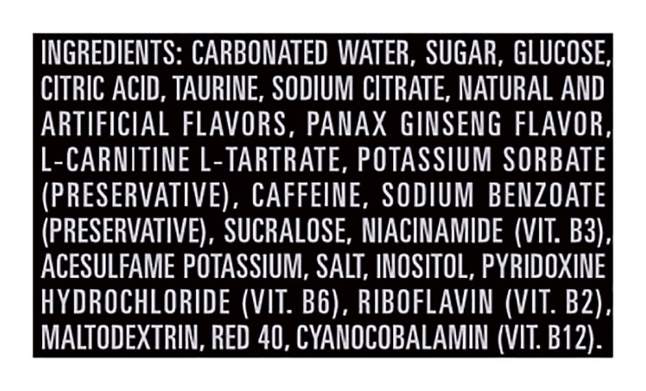 Ingredients: Carbonated Water, Sugar, Glucose, Citric Acid, Taurine, Sodium Citrate, Natural and Artificial Flavors, Panax Ginseng Flavor, I L-Carnitine L-Tartrate, Potassium Sorbate (Preservative), Caffeine, Sodium Benzoate (Preservative), Sucralose, Niacinamide (Vit. B3), Acesulfame Potassium, Salt, Inositol, Pyridoxine Hydrochloride (Vit. B6), Riboflavin (Vit. B2), Maltodextrin, Red 40, Cyanocobalamin (Vit. B12). Monster Energy Blend: Glucose, Taurine, L-Carnitine, Caffeine, Inositol, Maltodextrin