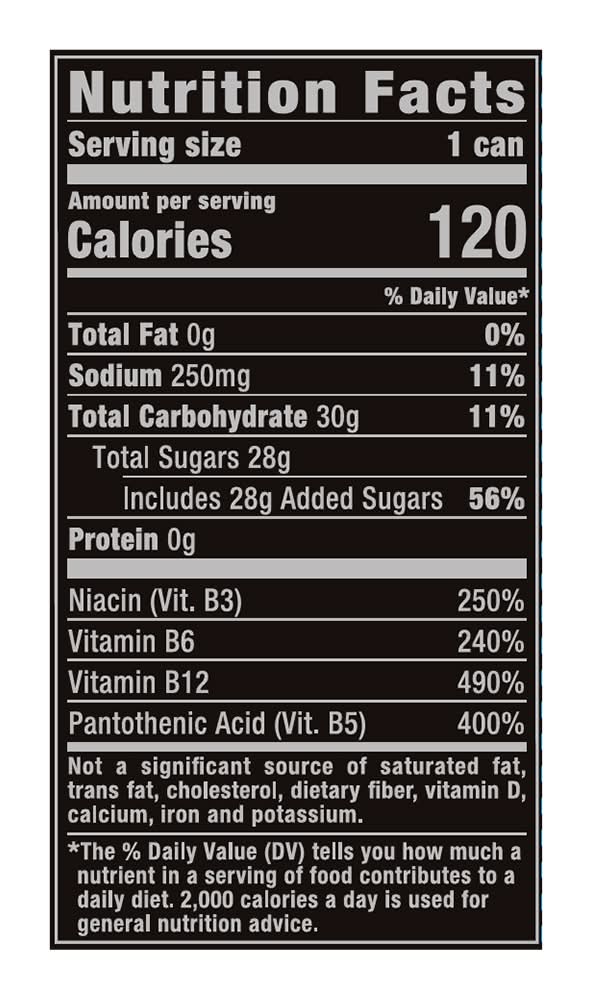 Ingredients: Carbonated Water Sugar Glucose Taurine Citric Acid Sodium Citrate Natural Flavors Panax Ginseng Flavor Sodium Benzoate (Preservative) L-Carnitine L-Tartrate Caffeine Potassium Sorbate (Preservative) Sucralose Niacinamide (Vit. B3) Maltodextrin D-Calcium Pantothenate (Vit. B5) Salt Inositol Pyridoxine Hydrochloride (Vit. B6) Red 40 Cyanocobalamin (Vit. B12). Contains 160mg of caffeine