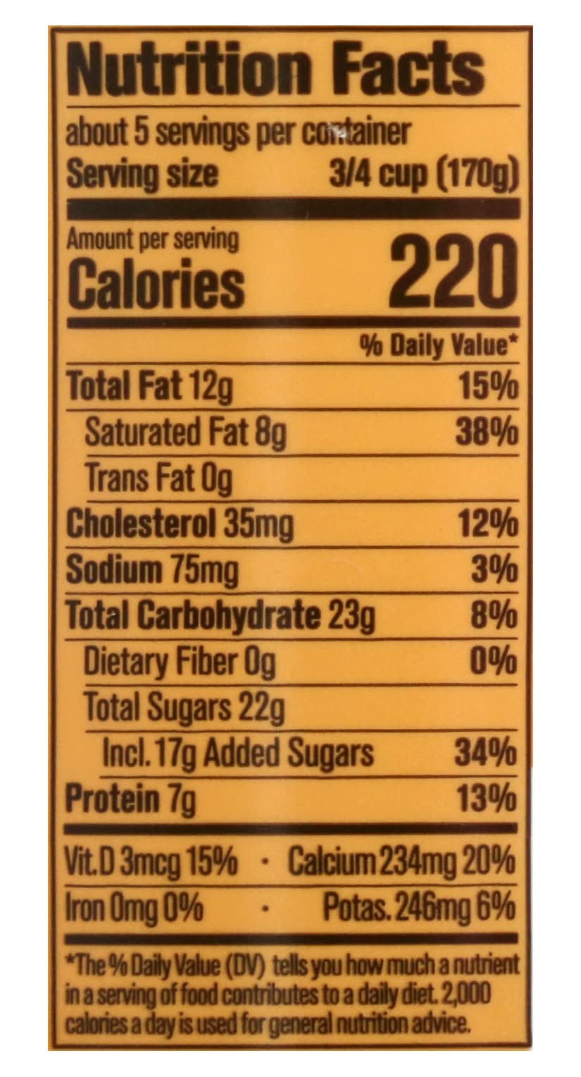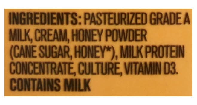 Ingredients: Pasteurized Grade A Milk, Cream, Honey Powder (Cane Sugar, Honey [This Product Contains Honey and Should Not Be Consumed by Infants Under One Year of Age, ]), Milk Protein Concentrate, Culture, Vitamin D3, with Live and Active Probiotic Cultures: L. Acidophilus, B, Lactis, L, Rhamnosus, L. Casei Contains: Milk