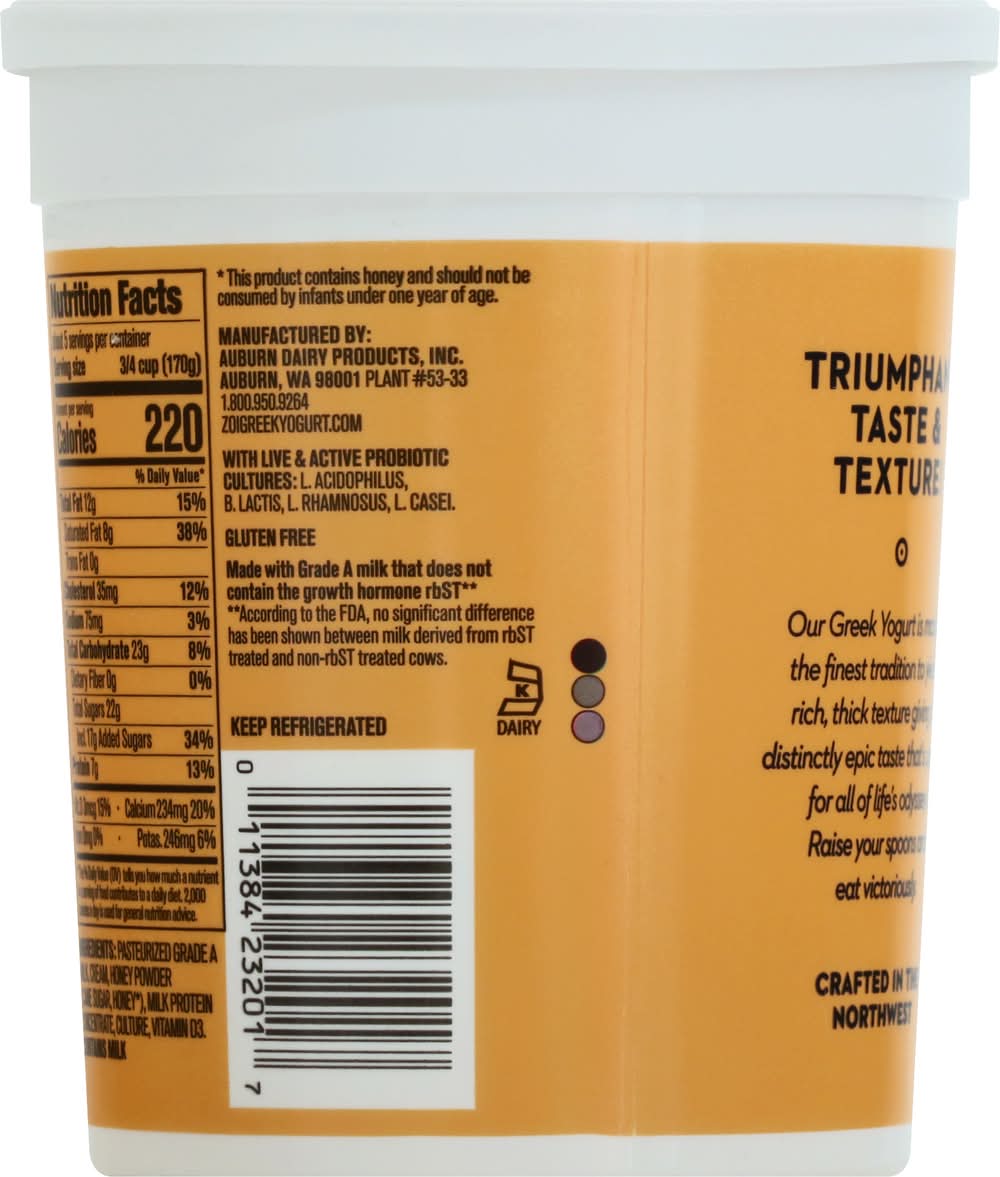 Gluten free. Vitamins D. Probiotic cultures. Crafted in the NW. Made with grade A milk that does not contain the growth hormone rbST (According to the FDA, no significant difference has been shown between milk derived from rbST treated and non-rbST treated cows). Triumphant taste and texture! Our Greek Yogurt is made in the finest tradition to yield a rich, thick texture giving it a distinctly epic taste that's perfect for all of life's odysseys. Raise your spoons and eat victoriously. Crafted in the Northwest. • Flavor: Honey • Auburn Dairy Products, Inc., Auburn, WA, 98001