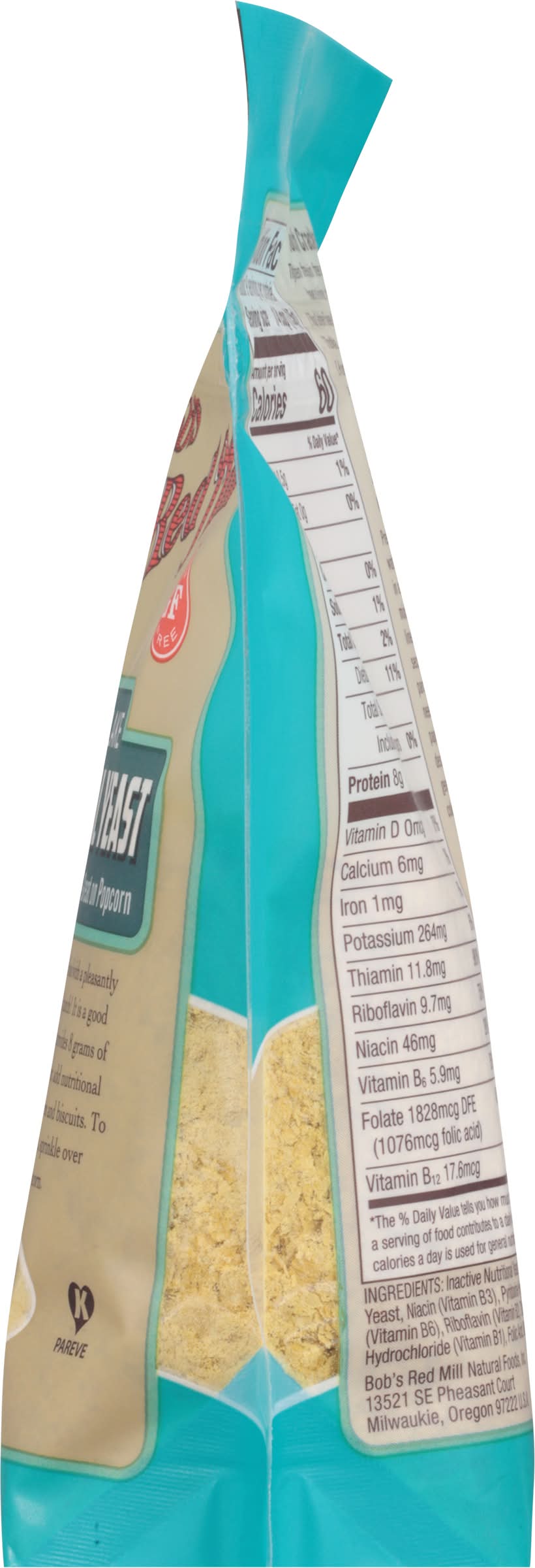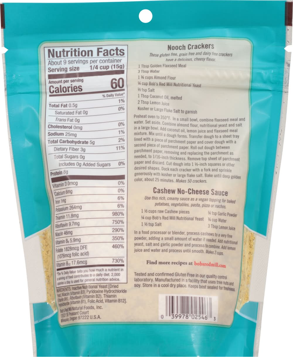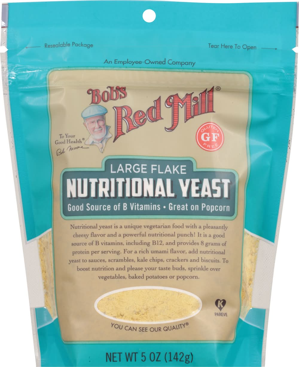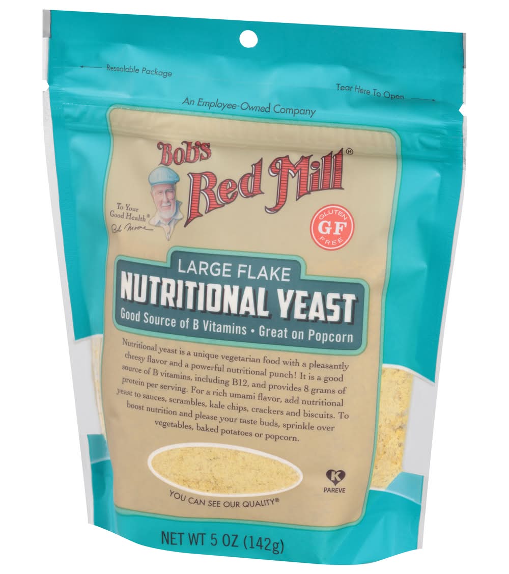 Gluten free. Tested and confirmed gluten free in our quality control laboratory. Good source of B vitamins. An employee-owned company. To your good health. - Bob Moore. Nutritional yeast is a unique vegetarian food with a pleasantly cheesy flavor and a powerful nutritional punch! It is a good source of B vitamins, including B12, and provides 8 grams of protein per serving. For a rich umami flavor, add nutritional yeast to sauces, scrambles, kale chips, crackers and biscuits. To boost nutrition and please your taste buds, sprinkle over vegetables, baked potatoes or popcorn. • Bob's Red Mill Natural Foods, Inc., Milwaukie, OR, 97222 • Packaging: Reusable