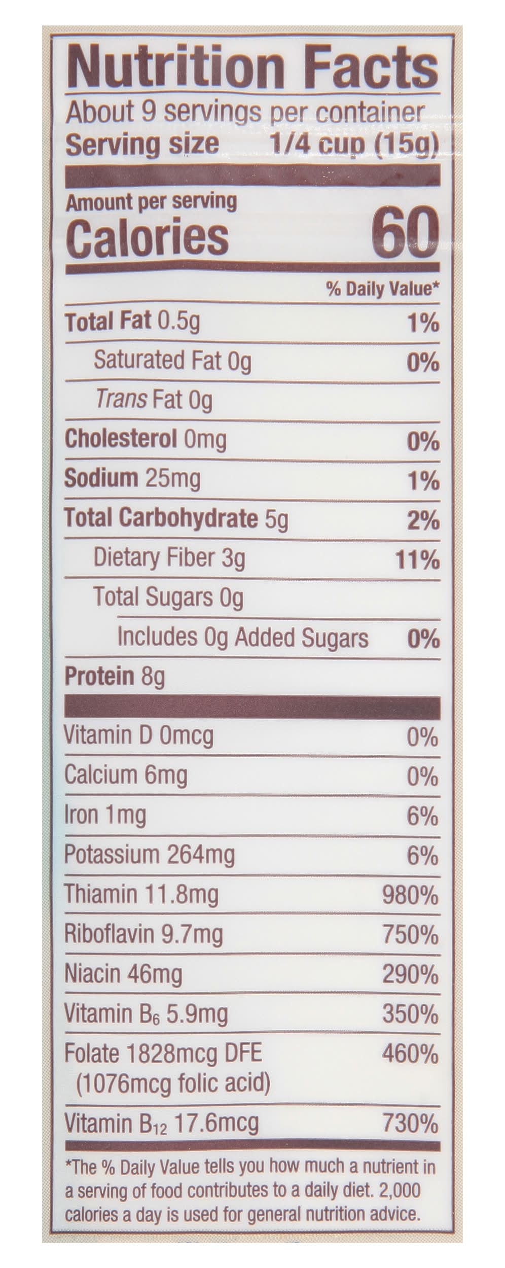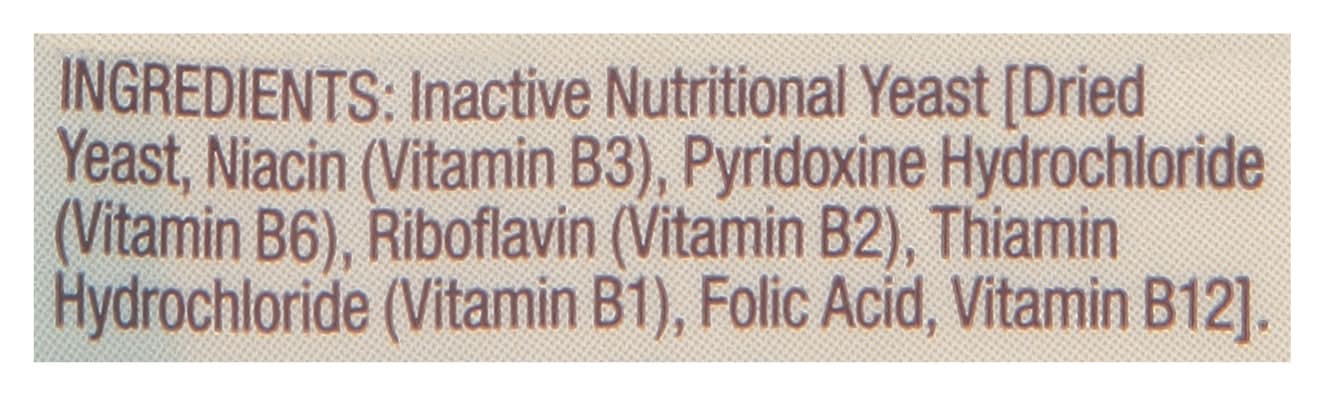 Ingredients: Inactive Nutritional Yeast [Dried Yeast, Niacin (Vitamin B3), Pyridoxine Hydrochloride (Vitamin B6), Riboflavin (Vitamin B2), Thiamin Hydrochloride (Vitamin B1), Folic Acid, Vitamin B12] Contains: Tree Nuts, Soybeans