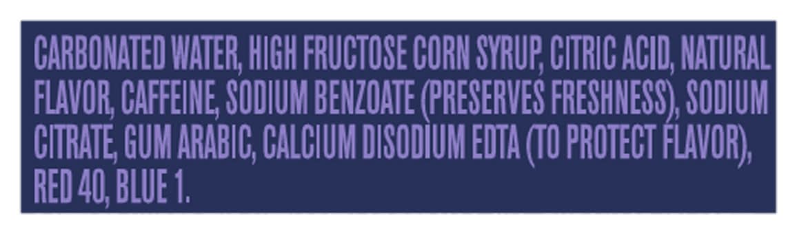 Ingredients: Carbonated Water, High Fructose Corn Syrup, Citric Acid, Natural Flavor, Caffeine, Sodium Benzoate (Preserves Freshness), Sodium Citrate, Gum Arabic, Calcium Disodium EDTA (to Protect Flavor), Red 40, Blue 1. Contains: Corn