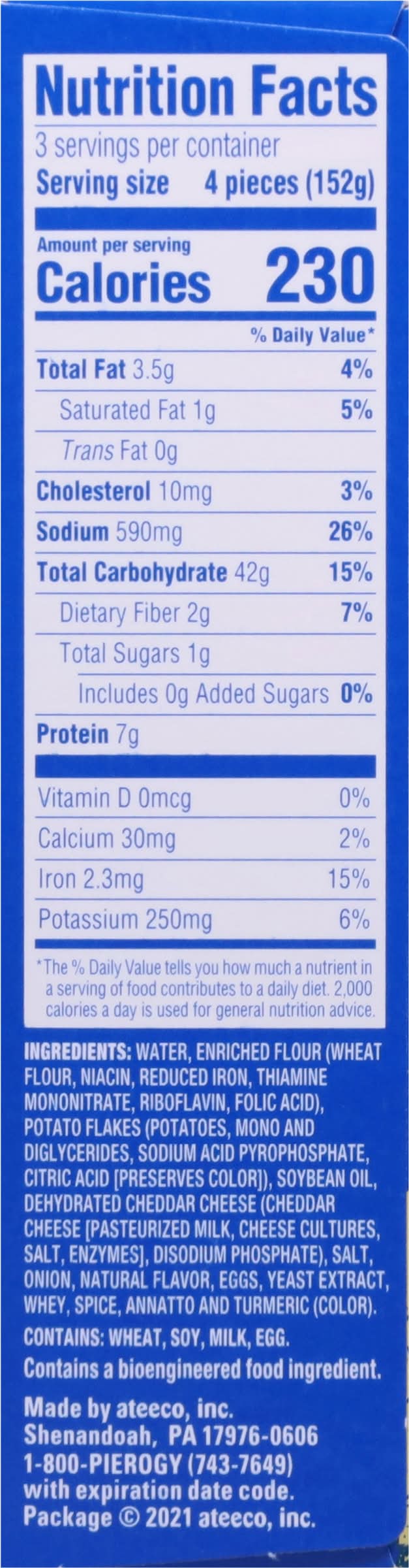 Aged sharp cheddar cheese & creamy whipped potatoes wrapped in tender pasta. Contains a bioengineered food ingredient. Ateeco, Inc., Shenandoah, Pa.