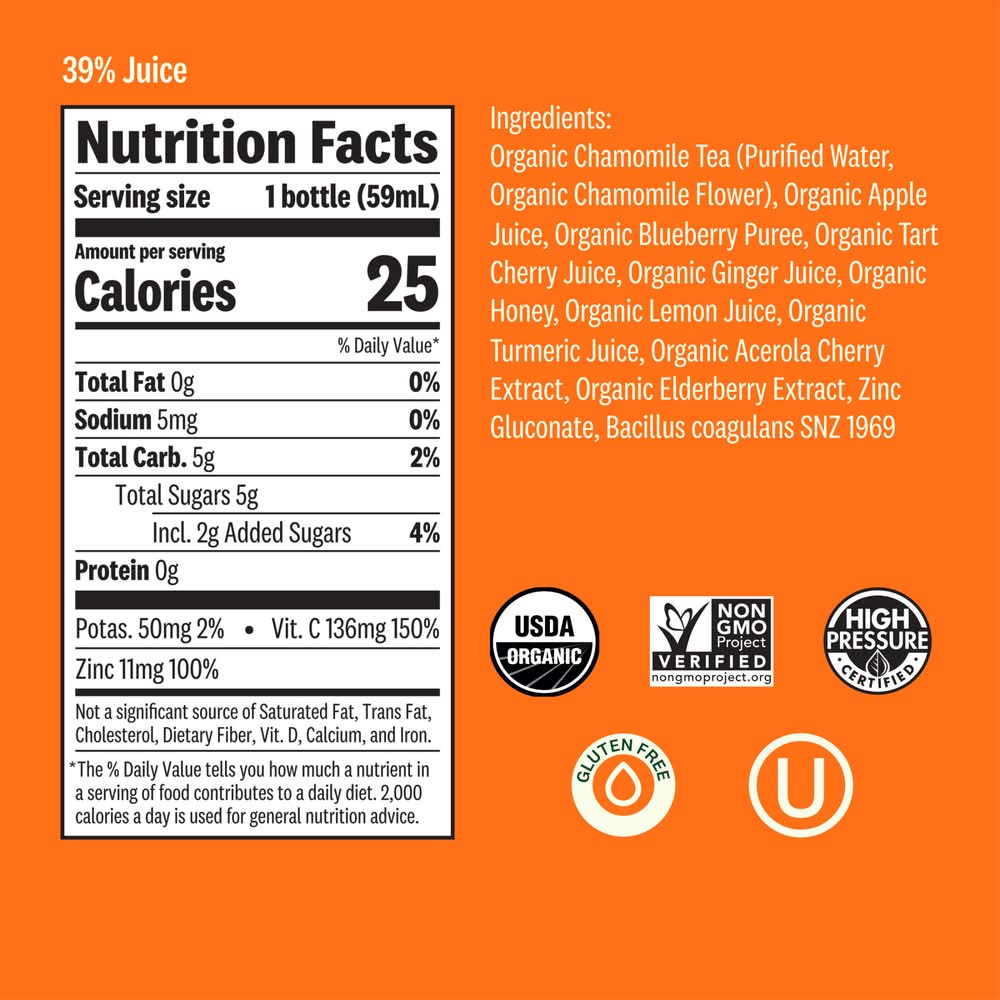 Ingredients: Organic Chamomile Tea (Purified Water, Organic Chamomile Flower), Organic Apple Juice, Organic Blueberry Puree, Organic Tart Cherry Juice, Organic Ginger Juice, Organic Honey, Organic Lemon Juice, Organic Turmeric Juice, Organic Acerola Cherry Extract, Organic Elderberry Extract, Zinc Gluconate, Bacillus coagulans SNZ 1969