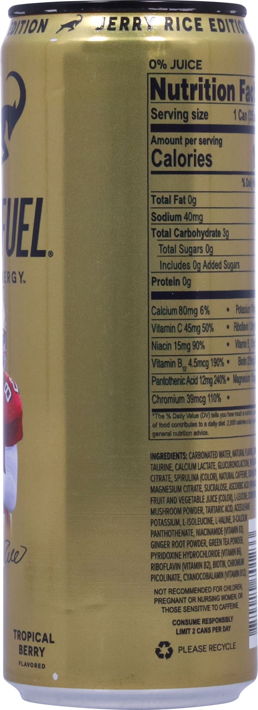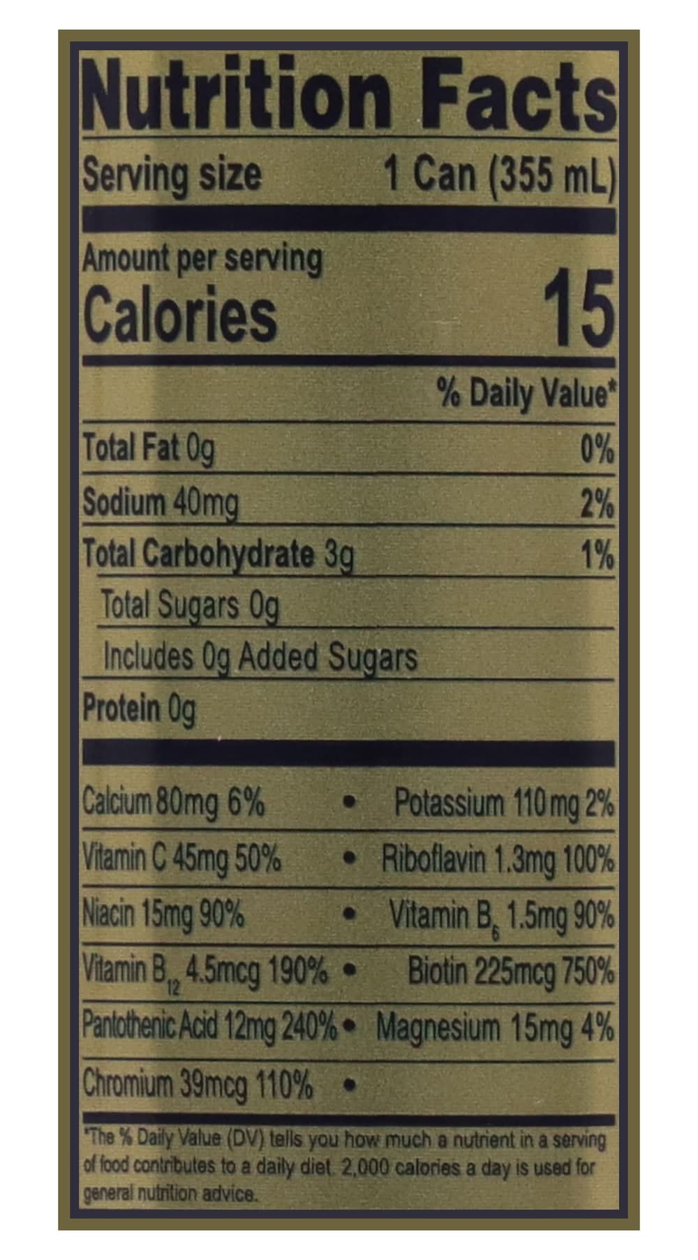 Ingredients: Carbonated Water, Natural Flavors, Citric Acid, Taurine, Calcium Lactate, Glucuronolactone, Potassium Citrate, Spirulina (Color), Natural Caffeine, Sodium Citrate, Magnesium Citrate, Sucralose, Ascorbic Acid (Vitamin C), Fruit and Vegetable Juice (Color), L-Leucine, Cordyceps Mushroom Powder, Tartaric Acid, Acesulfame Potassium, L-Isoleucine, L-Valine, D-Calcium Panthothenate, Niacinamide (Vitamin B3), Ginger Root Powder, Green Tea Powder, Pyridoxine Hydrochloride (Vitamin B6), Riboflavin (Vitamin B2), Biotin, Chromium Picolinate Cyanocobalamin (Vitamin B12) Contains 200mg of caffeine