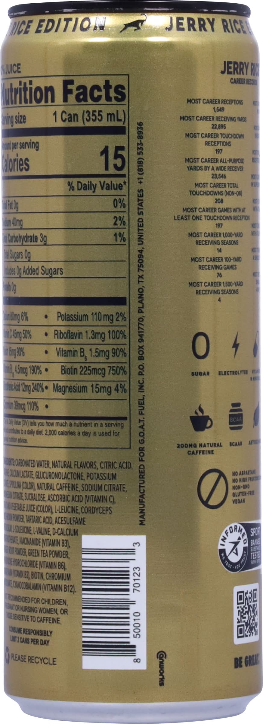 Sports Tropical Berry Flavored Energy Drink • G.O.A.T. Fuel, Inc., P.O. Box 229, North Hollywood, CA, 91603 • Packaging: Reusable