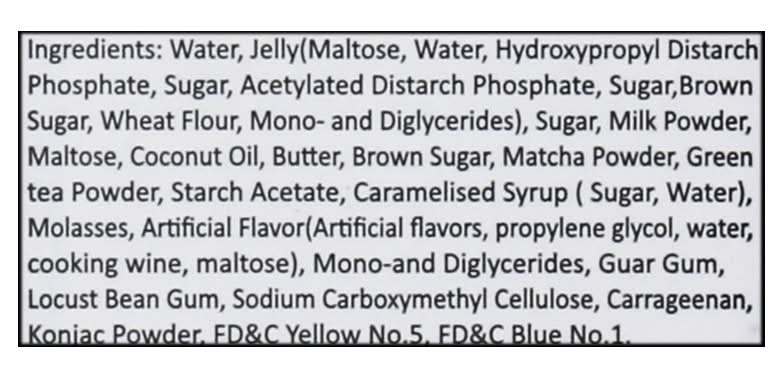 Ingredients: Water, Jelly (Maltose Water Hydroxypropyl Distarch Phosphate Sugar Acetylated Distarch Phosphate Sugar Brown Sugar Wheat Flour Mono- and Diglycerides), Sugar, Milk Powder, Maltose, Coconut Oil, Butter, Brown Sugar, Matcha Powder, Green Tea Powder, Starch Acetate, Caramelised Syrup ( Sugar Water), Molasses, Artificial Flavor (Artificial Flavors Propylene Glycol Water Cooking Wine Maltose), Mono-and Diglycerides, Guar Gum, Locust Bean Gum, Sodium Carboxymethyl Cellulose, Carrageenan, Konjac Powder, FD&C Yellow No.5, FD&C Blue No1 Contains: Wheat, Milk, Tree Nuts, Peanuts, Eggs, Sesame, Gluten, Soybeans