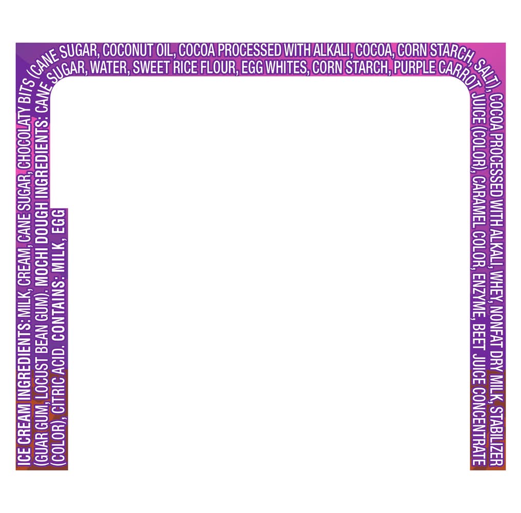 Ingredients: Ice Cream Ingredients: Milk, Cream, Cane Sugar, Chocolaty Bits (Cane Sugar Coconut Oil, Cocoa Processed with Alkali Cocoa, Corn Starch, Salt), Cocoa Processed with Alkali, Whey, Nonfat Dry Milk, Stabilizer (Guar Gum, Locust Bean Gum), Mochi Dough Ingredients: Cane Sugar, Water, Sweet Rice Flour, Egg Whites, Corn Starch, Purple Carrot Juice (Color), Caramel Color, Enzyme, Beet Juice Concentrate (Color), Citric Acid Contains: Milk, Tree Nuts, Coconuts, Corn, Eggs