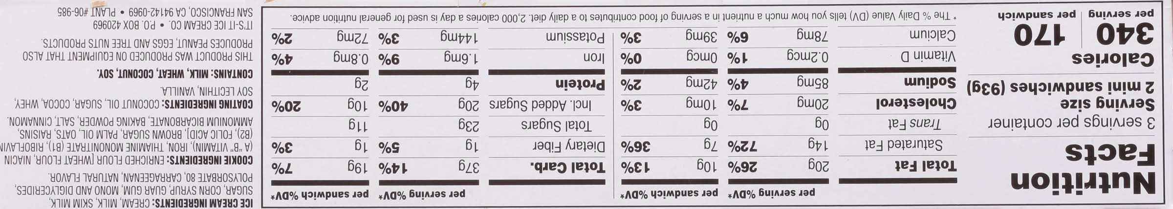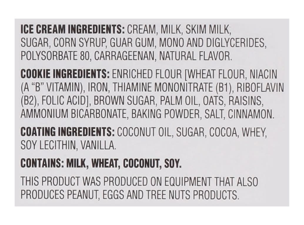 Ingredients: Ice Cream Ingredients: Cream, Milk, Skim Milk, Sugar, Corn Syrup, Guar Gum, Mono and Diglycerides, Polysorbate 80, Carrageenan, Natural Flavor, Cookie Ingredients: Enriched Flour [Wheat Flour, Niacin (a B Vitamin), Iron, Thiamine Mononitrate (B1), Riboflavin (B2), Folic Acid), Brown Sugar, Palm Oil, Oats, Raisins, Ammonium Bicarbonate, Baking Powder, Salt, Cinnamon, Coating Ingredients: Coconut Oil, Sugar, Cocoa, Whey, Soy Lecithin, Vanilla Contains: Milk, Corn, Tree Nuts, Coconuts, Wheat, Soybeans, Oat, Peanuts, Eggs, Tree Nuts